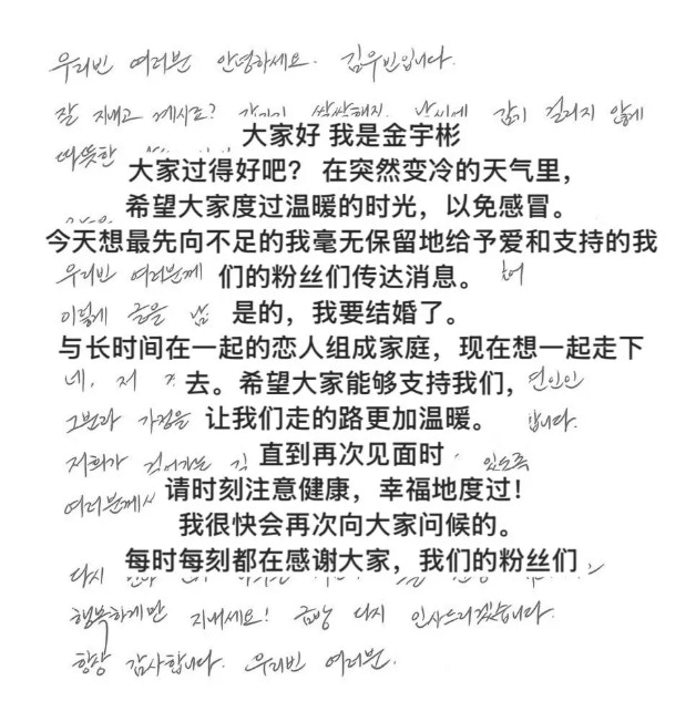 11月20日,金宇彬在社交平台上傳一封手寫信,正式官宣與申敏兒結婚,婚禮將在12月20日於韓國首爾舉行,以非公開形式,僅邀請雙方親友和親戚。這對「純愛戀人」要升級為「純愛夫妻」終成眷屬,粉絲們感到非常開心,祝福聲浪席捲社交媒體。
