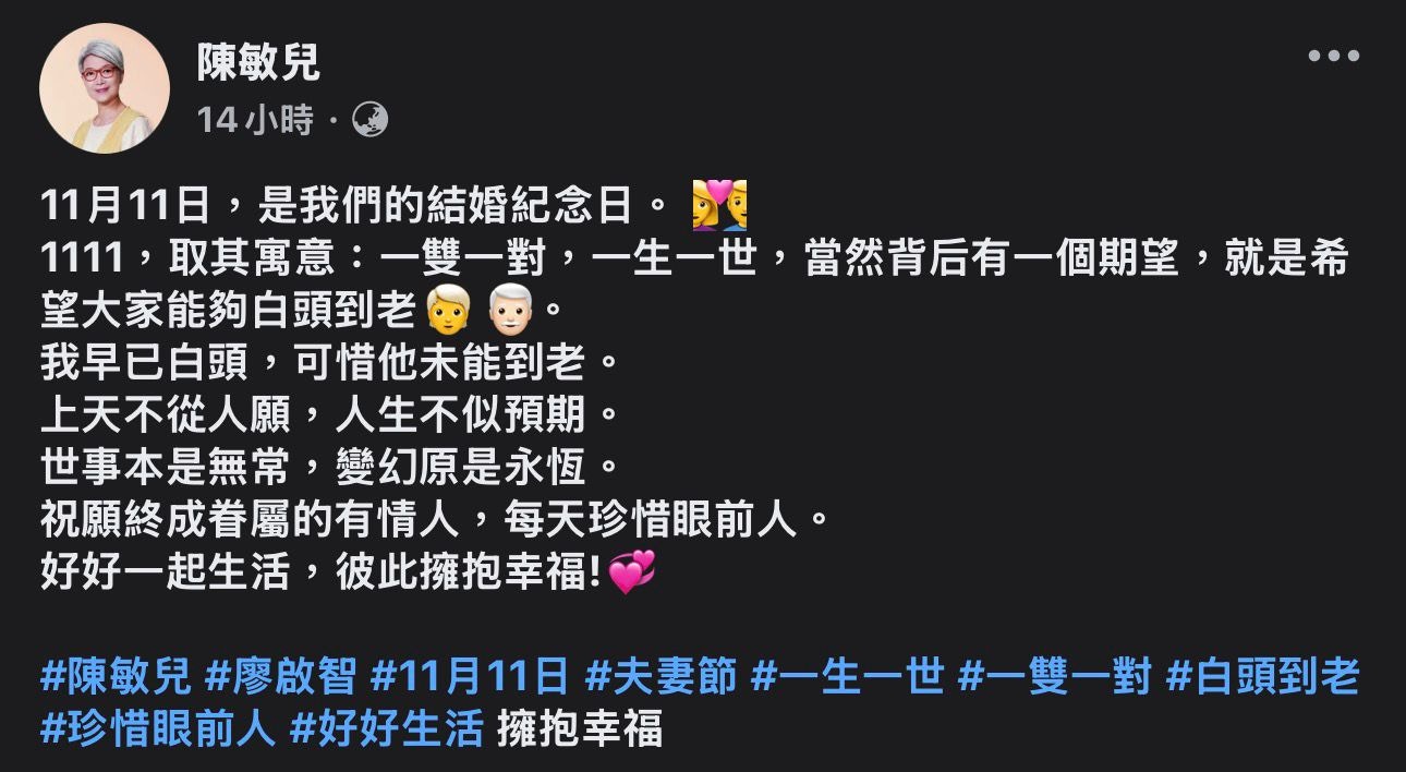 陳敏兒在文中分享了「11月11日」這個日子的特殊寓意。她寫道:「11月11日,是我們的結婚紀念日。1111,取其寓意:一雙一對,一生一世,當然背后有一個期望,就是希望大家能夠白頭到老。」然而世事無常,陳敏兒也不禁感嘆:「我早已白頭,可惜他未能到老。上天不從人願,人生不似預期。世事本是無常,變幻原是永恆。」字裡行間流露出對亡夫的深切懷念。