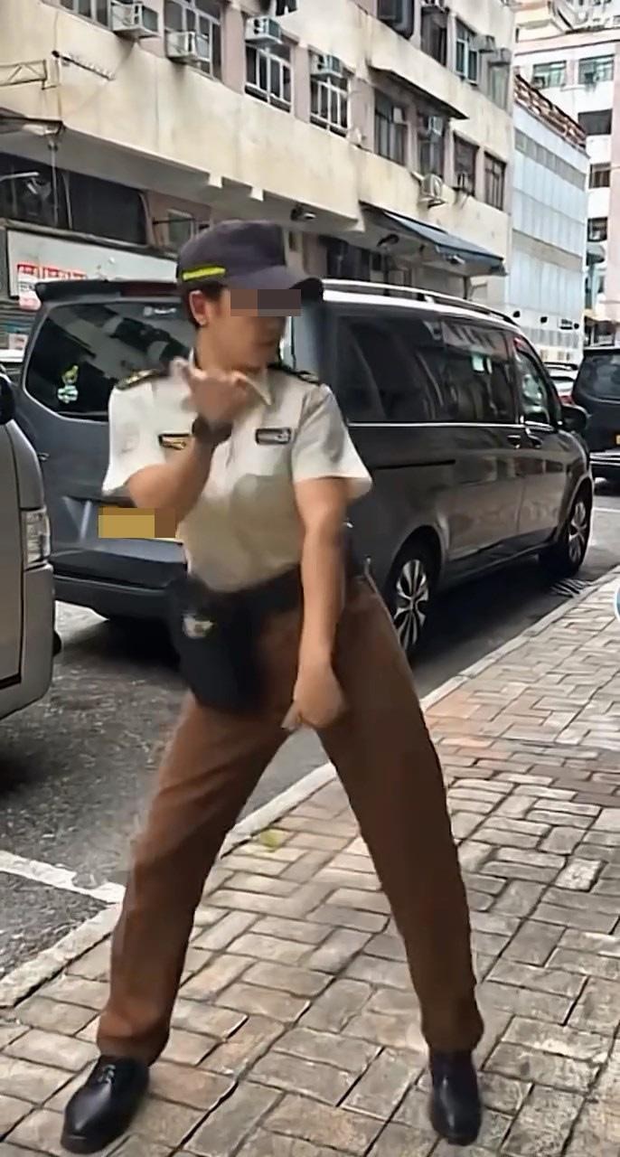 1名穿上疑似交通督導員制服的女子大動作跳舞,舉手扭臀左右搖動身姿,看似樂在其中。(網上影片截圖)