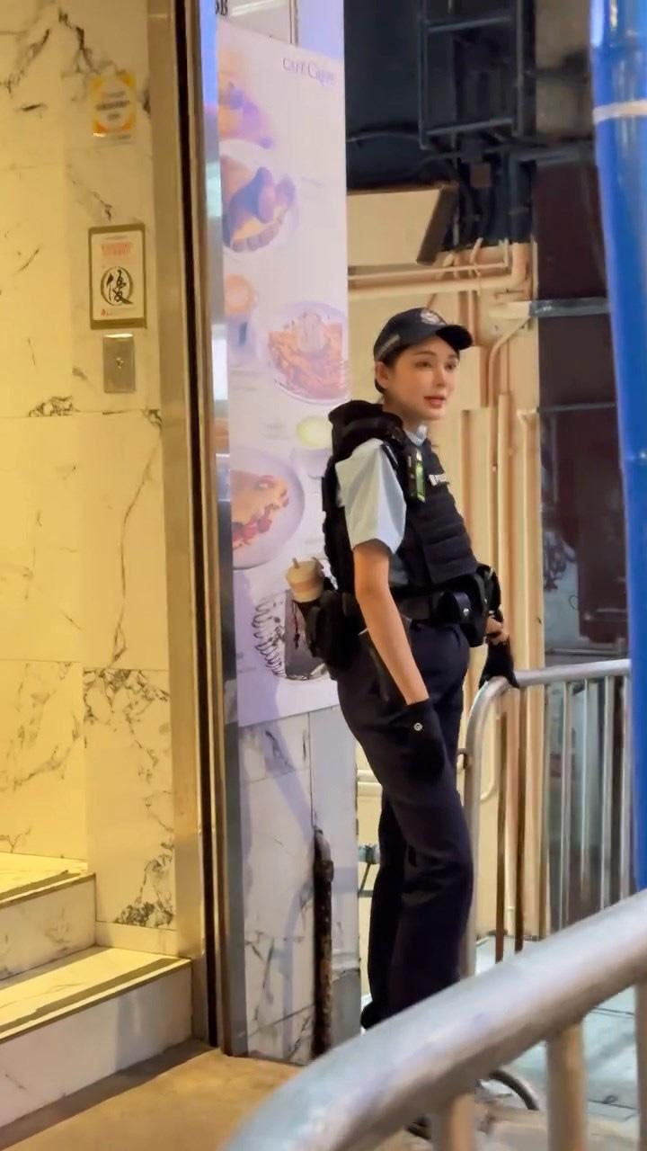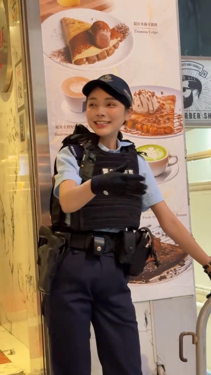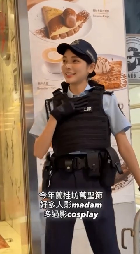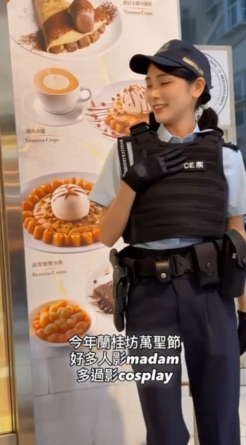 有「香港仙氣女警」之稱的女輔警梁凱程(Natalie)穿上軍裝,與1名女警拍檔,在蘭桂坊1條巷前維持秩序。(Threads@henryychannn)