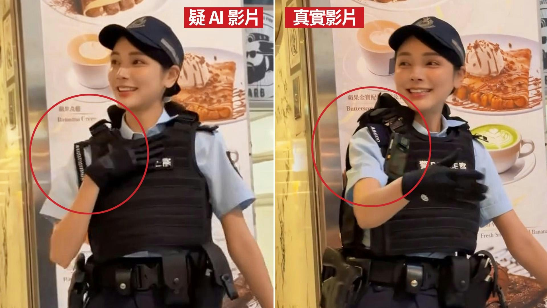 有網民指出,影片中女子酷似有「香港仙氣女警」之稱的女輔警梁凱程(Natalie),但有2個地方大不同。(左圖:疑AI影片/右圖:真實影片)