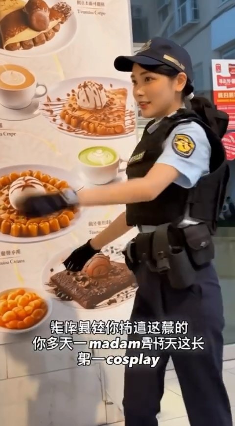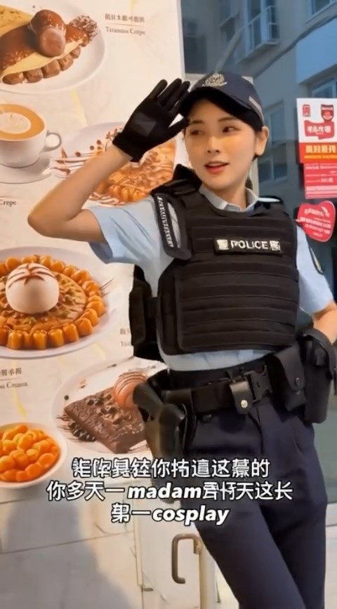 女子穿上寫有「Police」、疑似中文字「警察」的戰術背心,戴上印有疑似警徽的深色「鴨嘴帽」,腰纏疑似裝有手鎗的鎗袋,面露笑容在街頭跳舞。(Threads@mobilefoodieyt)