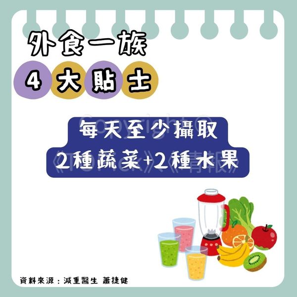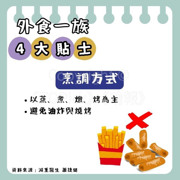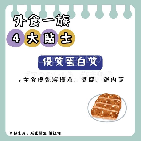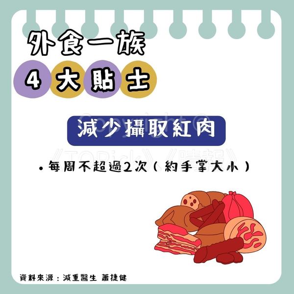 台灣大腸直腸外科醫生謝依蒨曾在其Facebook專頁發文,提醒外食族若想維持腸道健康,應優先選擇魚、豆腐、雞肉等優質蛋白質,紅肉每周不超過2次(約手掌大小);同時每天至少攝取2種蔬菜與2種水果,確保纖維攝取充足。烹調方式也建議以蒸、煮、燉、烤為主,避免油炸與燒烤。