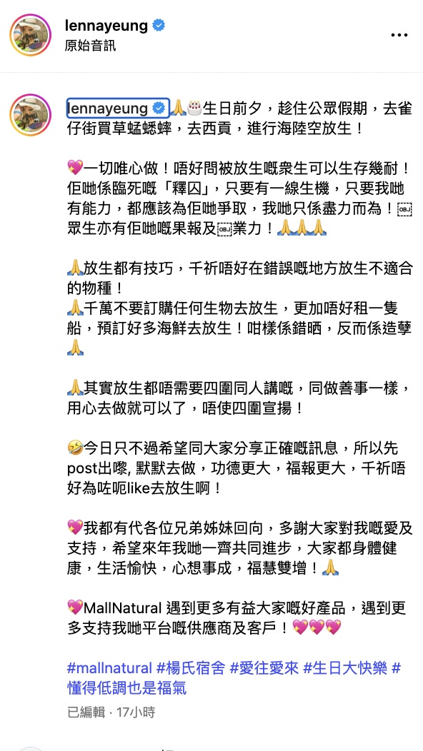 楊卓娜又趁生日去雀仔街買草蜢蟋蟀,以及去西貢買海鮮放生。楊卓娜解釋放生緣由:「一切唯心做!唔好問被放生嘅衆生可以生存幾耐!佢哋係臨死嘅『釋囚』,只要有一線生機,只要我哋有能力,都應該為佢哋爭取,我哋只係盡力而為!眾生亦有佢哋嘅果報及業力」。她又指會「有技巧」地放生,「放生都有技巧,千祈唔好在錯誤嘅地方放生不適合的物種!千萬不要訂購任何生物去放生,更加唔好租一隻船,預訂好多海鮮去放生!咁樣係錯晒,反而係造孽」。