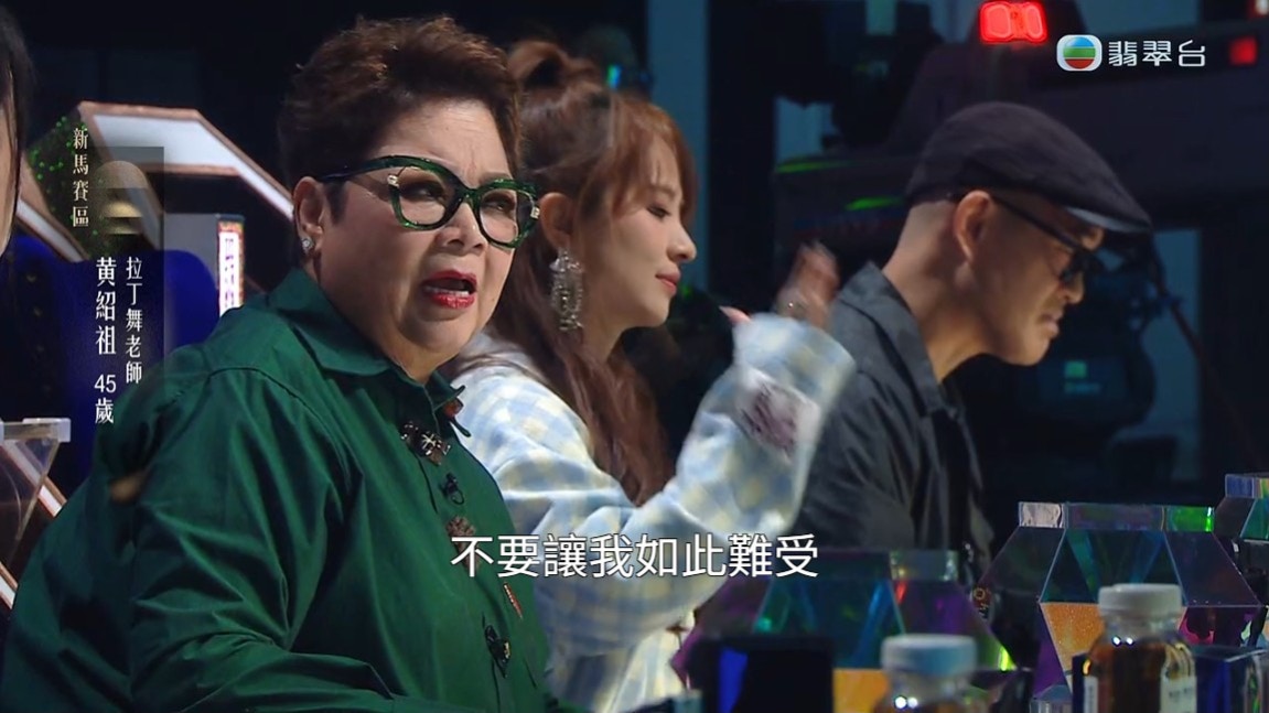 黃紹祖唱到「不要讓我如此難受」時,肥媽張開口呆住了,一副像說「我好難受」的表情。(節目截圖)