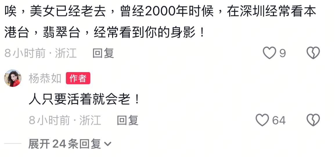 有人留言嘆道:「唉,美女已經老去,曾經2000年時候,在深圳經常看本港台,翡翠台,經常看到你的身影!」楊恭如大方接受老去,她回覆道:「人只要活着就會老!」