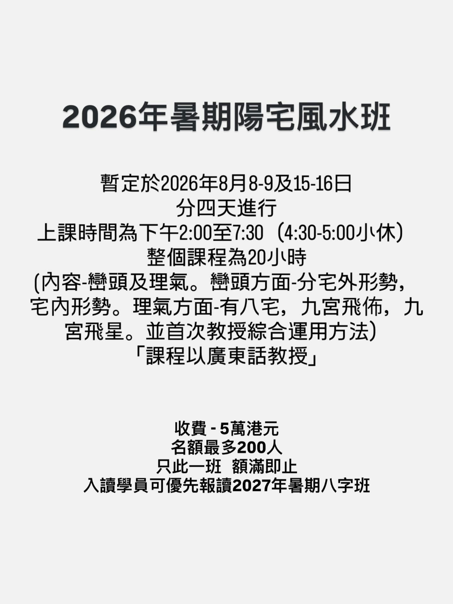 蘇民峰宣布「2026年暑期陽宅風水班」暫定於2026年8月8-9及15-16日,分4天進行,上課時間為下午2:00時至7:30,期間4:30-5:00小休,即上課時間總共5小時,整個課程為20小時。課程以廣東話教授,收費為5萬港元,名額最多200人,而且只此一班,額滿即止,入讀的學員亦可優先報讀2027年暑期八字班。有網民估計蘇民峰今次開班總收入可達1,000萬港元,平均每小時收入50萬港元,每分鐘約賺8,333,相當驚人!