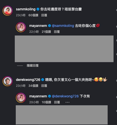 今日(21/11)她在個人社交平台上載幾張自拍照,寫道:「The perfect weather,最鐘意呢隻凍凍爽爽,但都要好好保暖」。帖文引來大批網民追問缺席原因,連高海寧也留言:「你去咗邊度呀?唔返嚟台慶」,黃建東更留言:「喂喂, 你欠曾文心一個大夾抱呀」,而麥美恩就以6字回覆高海寧:「去咗你個心度」,為缺席原因再添加上一層謎團。