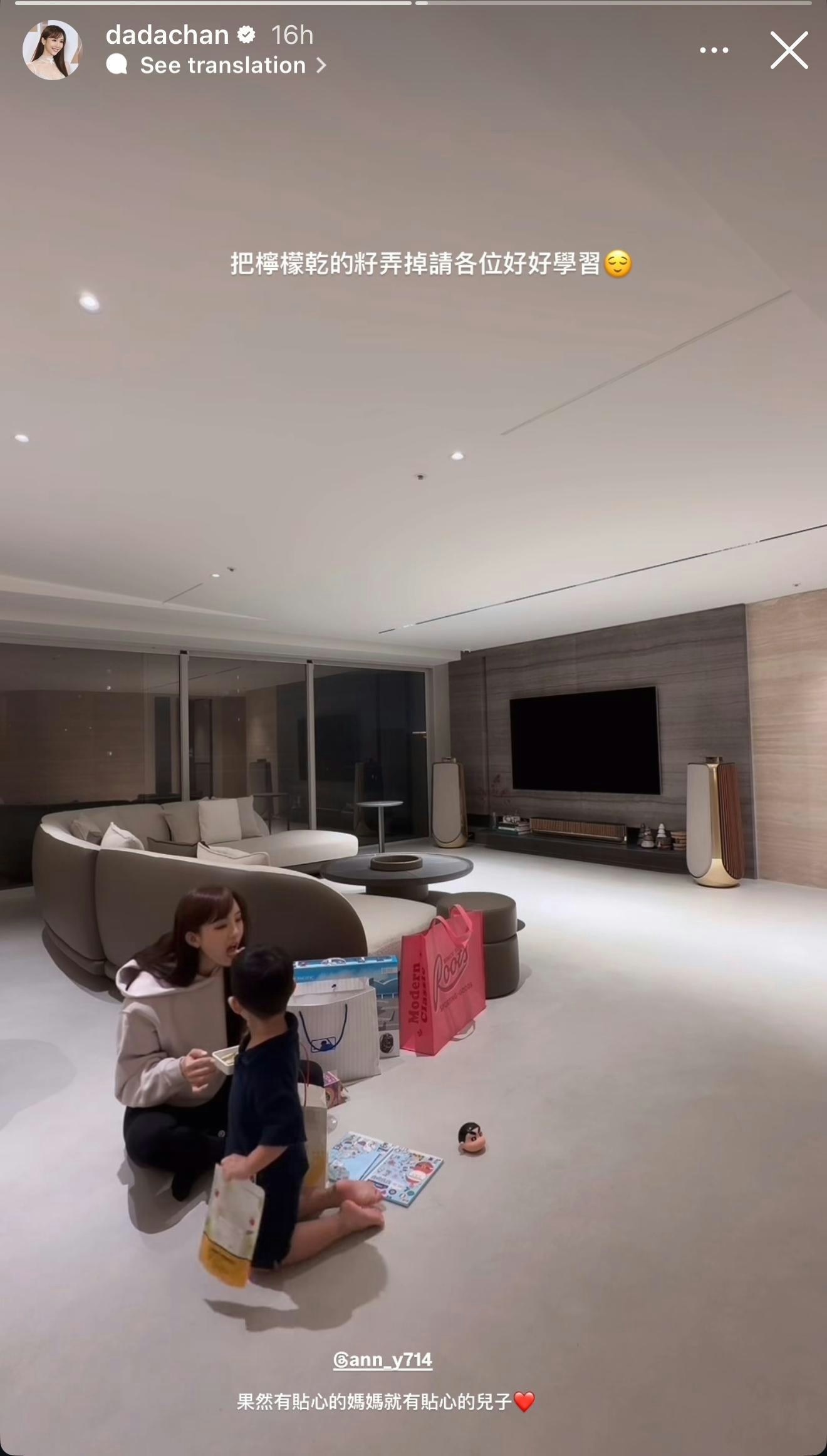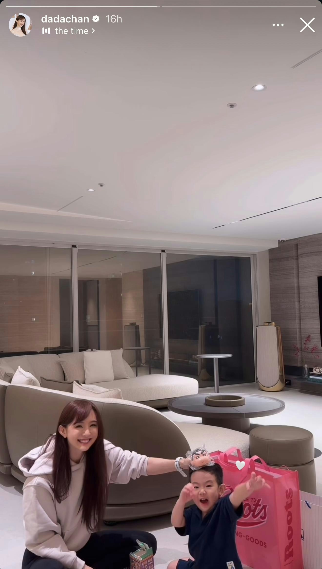 Dada近日於Instagram分享豪宅照,見她坐在地板上,與小男孩在地上玩耍。鏡頭特意影向屋內,大半個畫面都影向豪宅內景,似乎有意將焦點放在豪宅。豪宅內設有落地玻璃,空間廣闊,設計簡約奢華,相信價值不菲。Dada最後一則標註了一位朋友,相信該豪宅屬朋友家,近年身價水漲船高的Dada看來認識了不少有錢朋友。