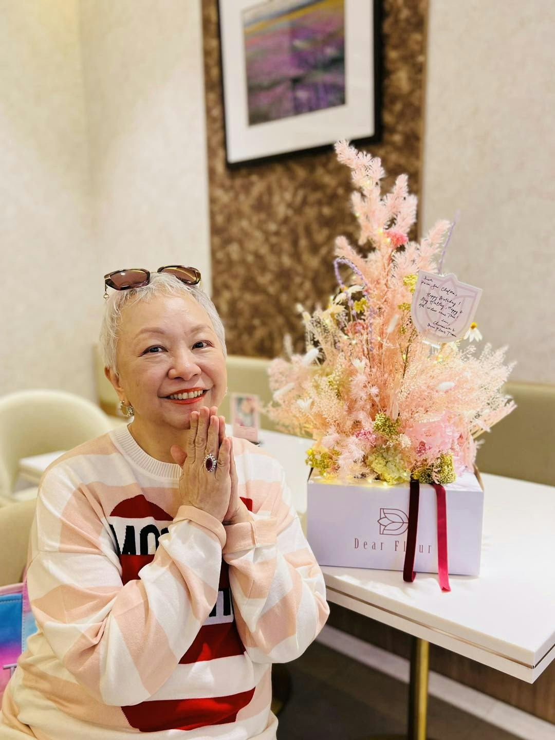 陳秋霞日前在Facebook分享了68歲慶生照,並留言寫道:「今天我68歲啦,謝謝大家的祝福,許願身體健康,笑口常開」。相中可見,穿上條紋上衣的陳秋霞,雙手合十笑容燦爛,雖然一頭銀髮,但皮膚依然緊緻,毫無半點醫美痕跡,精神飽滿狀態極佳。