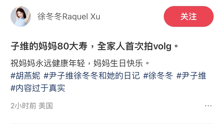 日頭在餐廳慶祝完後,夜晚又回家辦派對。胡燕妮在美國住大屋,環境優美,一家人生活舒適。尹子維和哥哥尹子洋孝順地入廚房煮飯,一家人在客廳又唱又跳,氣氛熱鬧。之後胡燕妮在客廳切蛋糕,洋溢幸福之情。徐冬冬之後重溫胡燕妮後生靚相,激讚奶奶氣質優雅,又發文祝胡燕妮生日快樂,「子維媽媽的80大壽,全家人首次拍vlog。祝媽媽永遠健康年輕,媽媽生日快樂」。