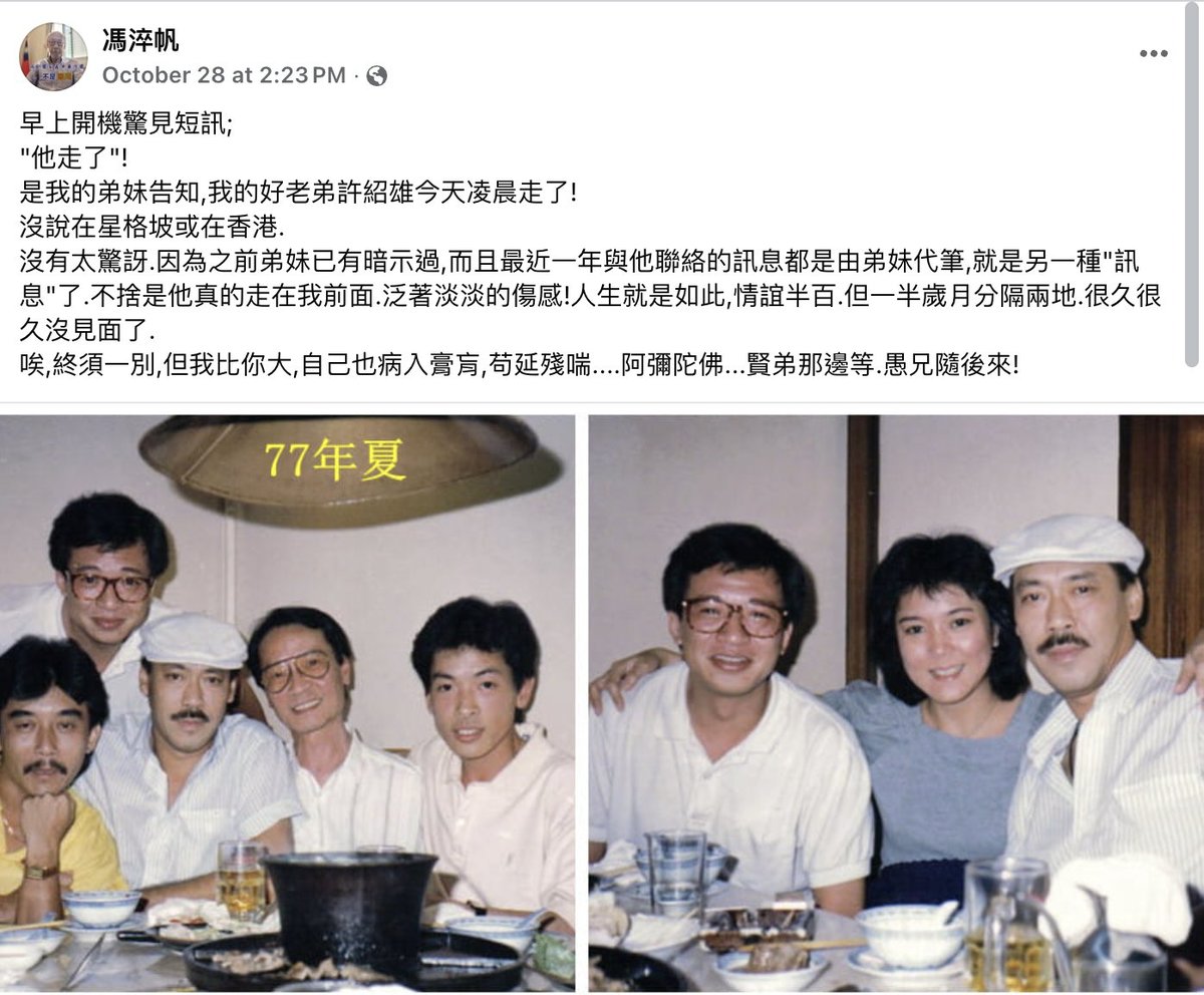 在3日前,馮淬帆才在個人社交平台發文哀悼「Benz哥」許紹雄離世,並說:「賢弟那邊等,愚兄隨後來!」沒想到一語成讖。