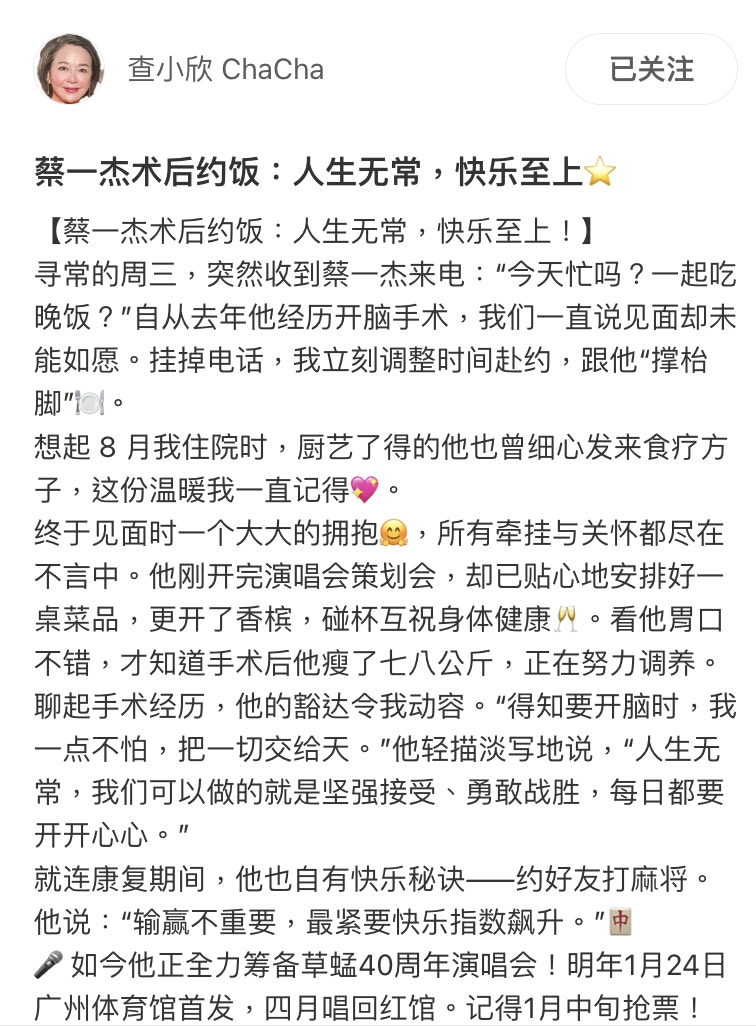 查小欣提到,原來蔡一傑術後暴瘦7、8公斤,「看他胃口不錯,才知道手術後他瘦了七八公斤,正在努力調養。」蔡一傑亦坦言,他不怕要開腦,將一切交給上天,又談到人生無常,「聊起手術經歷,他的豁達令我動容。“得知要開腦時,我一點不怕,把一切交給天。”他輕描淡寫地說,“人生無常,我們可以做的就是堅強接受、勇敢戰勝,每日都要開開心心。"」蔡一傑在休養期間,靠打麻將提振心情,「連康復期間,他也自有快樂秘訣—約好友打麻將。他說:"輸贏不重要,最緊要快樂指數飆升。」蔡一傑攬實查小欣影相,兩人相當老友。網民也祝蔡一傑身體健康。