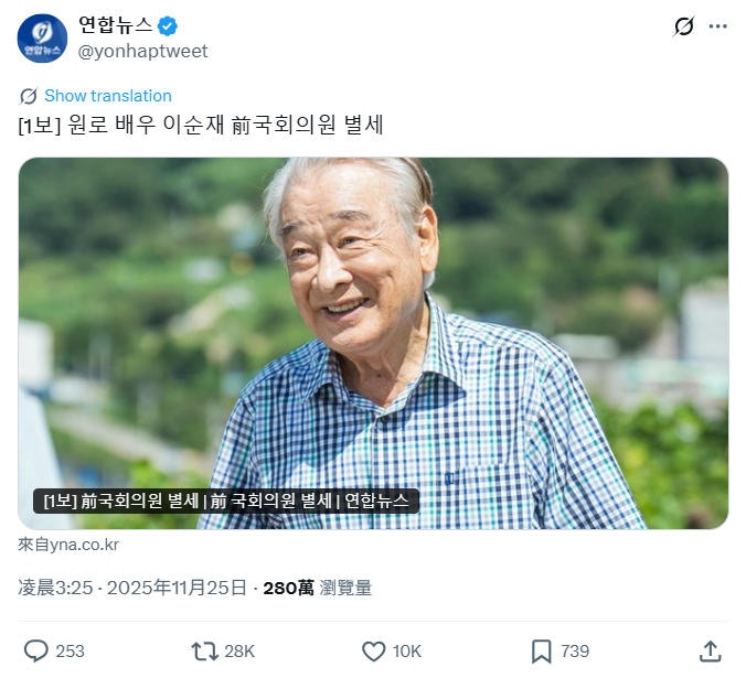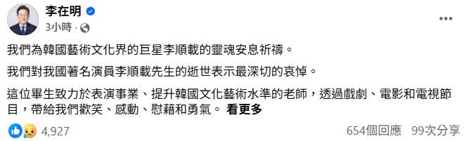「國民爺爺」李順載於2025年11月25日凌晨去世,按韓國傳統虛歲計算方式(出生即1歲)享年91歲,實際周歲為90歲(1935年10月10日出生)。當天韓國總統李在明還發文悼念,稱「他留下的作品和精神遺產将作為韓國寶貴的文化遺產代代相傅」。