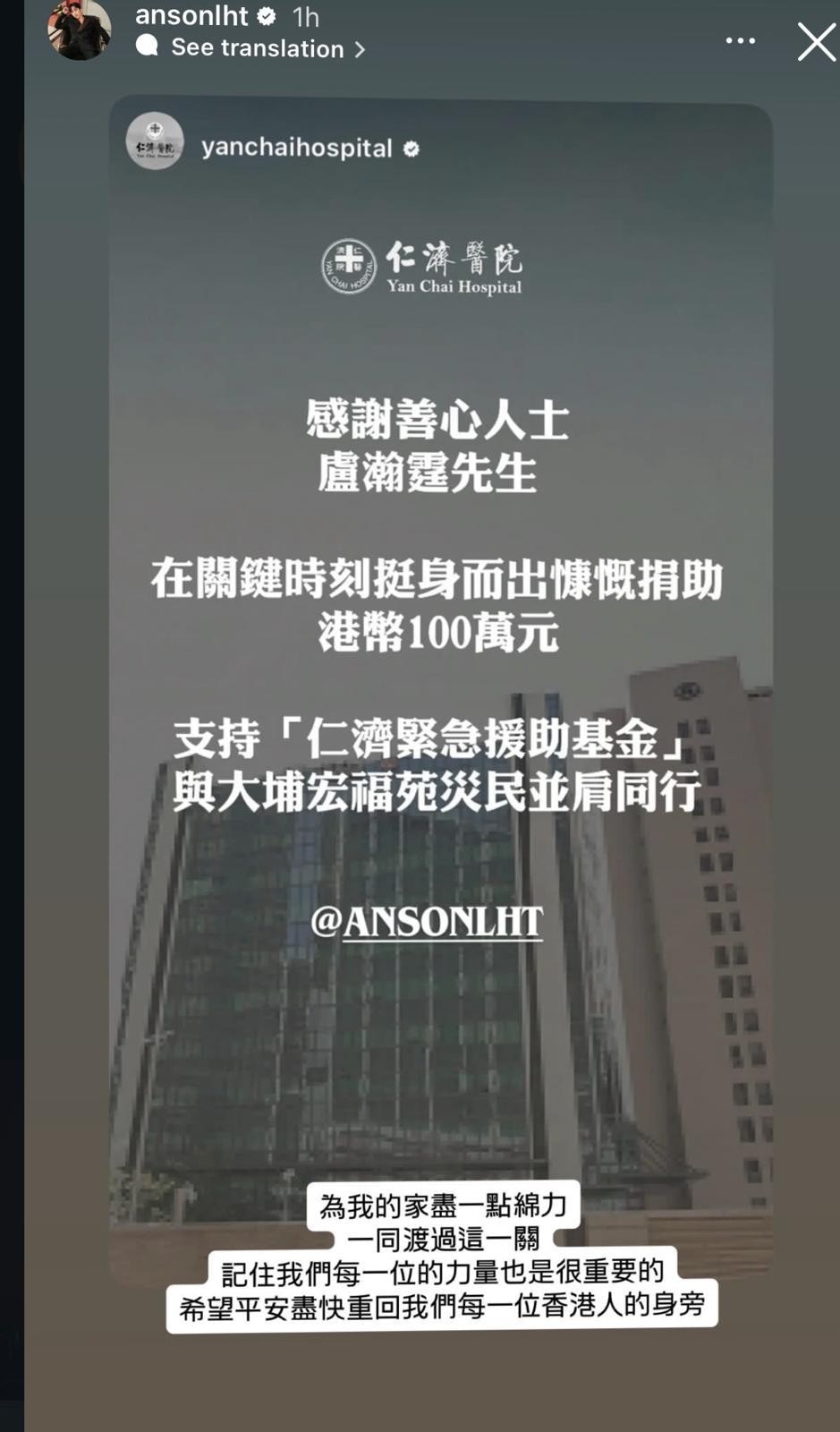 姜濤透過東華捐出100萬港元用作緊急援助災民,連同早前姜濤後援會捐出「7週年 Mini Keung's Charity Store」30萬盈利,姜濤與姜糖合共捐130萬港元賑災。而Anson Lo則損出100萬予「仁濟緊急援助基金」賑災,他亦婉謝粉絲在場外的應援,呼籲神徒將心意轉化為善款幫助災民。AK (江𤒹生) 和Tiger (邱傲然) 曾落區做義工。明日舉行演唱會的Jer (柳應廷) 將會損出首場收益予慈善平台,同樣呼籲粉絲將應援資金轉為捐款賑災。另外,梁朝偉與劉嘉玲就向「公益金及時雨大埔火災援助基金」合共捐出200萬元幫助災民。