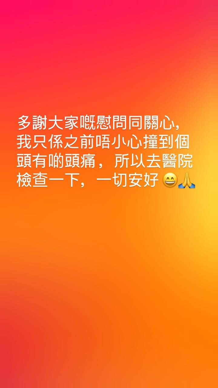 片中所見,劉晨芝坐在輪椅上,用手扶額,之後她接受腦部掃描,幸好檢查結果無異樣,由何超盈陪同出院,劉晨芝亦有報平安:「多謝大家嘅慰問同關心,我只係之前唔小心撞到個頭有啲頭痛,所以去醫院檢查一下,一切安好。」