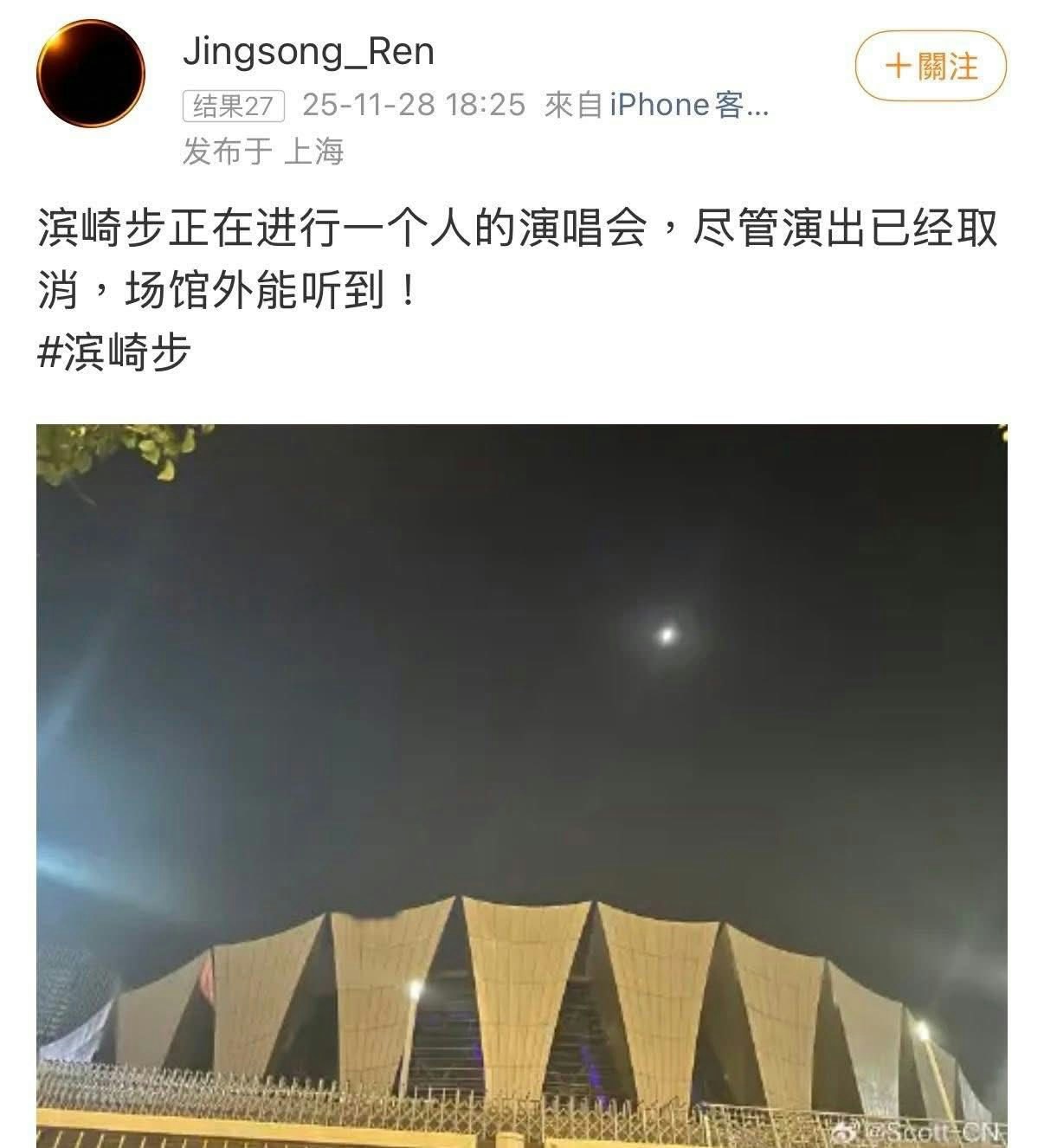 然而在昨晚,有上海網民上載會場外圍相片,表示︰「濱崎步正在進行一個人的演唱會,盡管演出已經取消,場館外能聽到!」網上亦流傳一張疑似會場內進行演唱的相片,寫道︰「濱崎步獨自在空無一人的演唱會表演。」