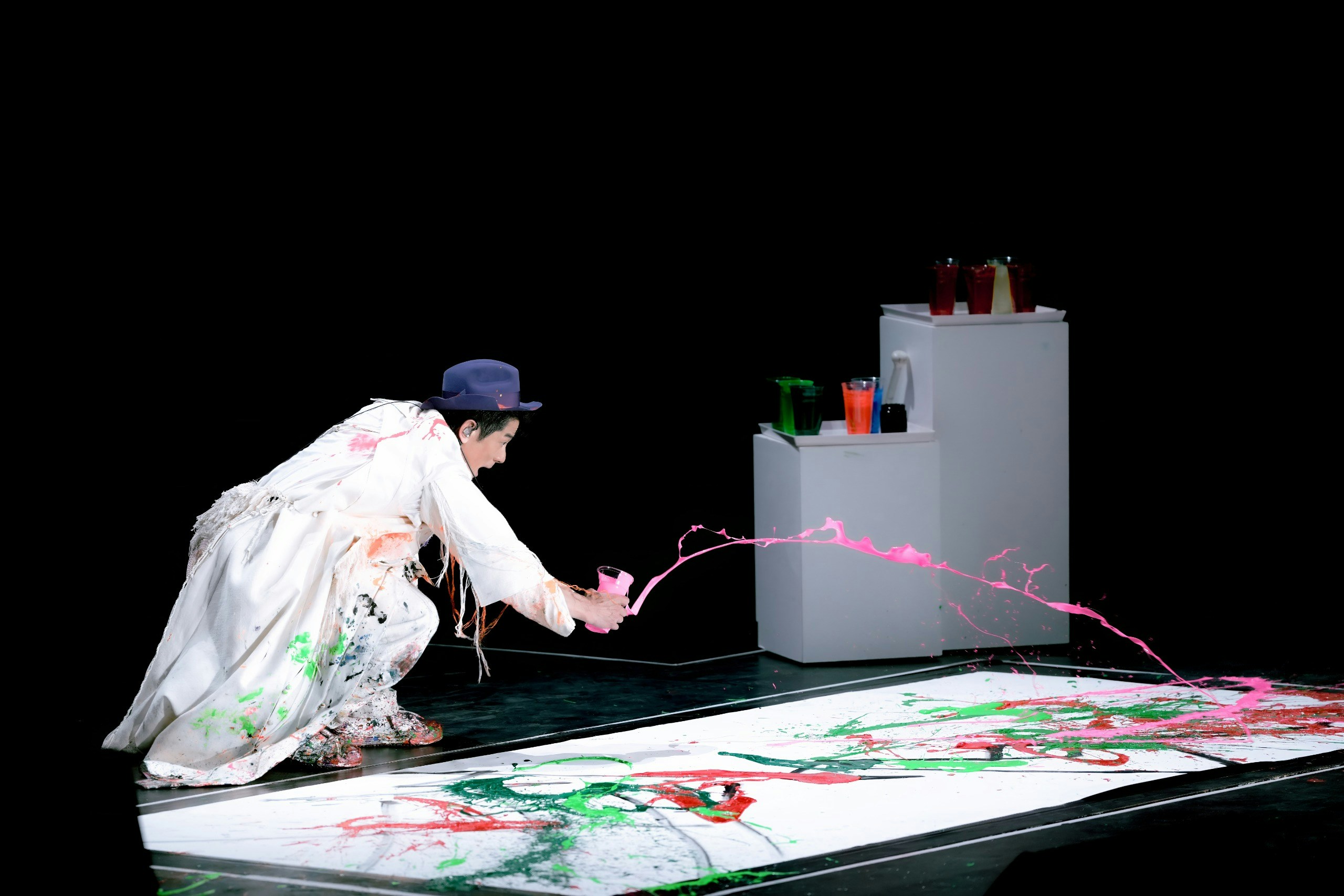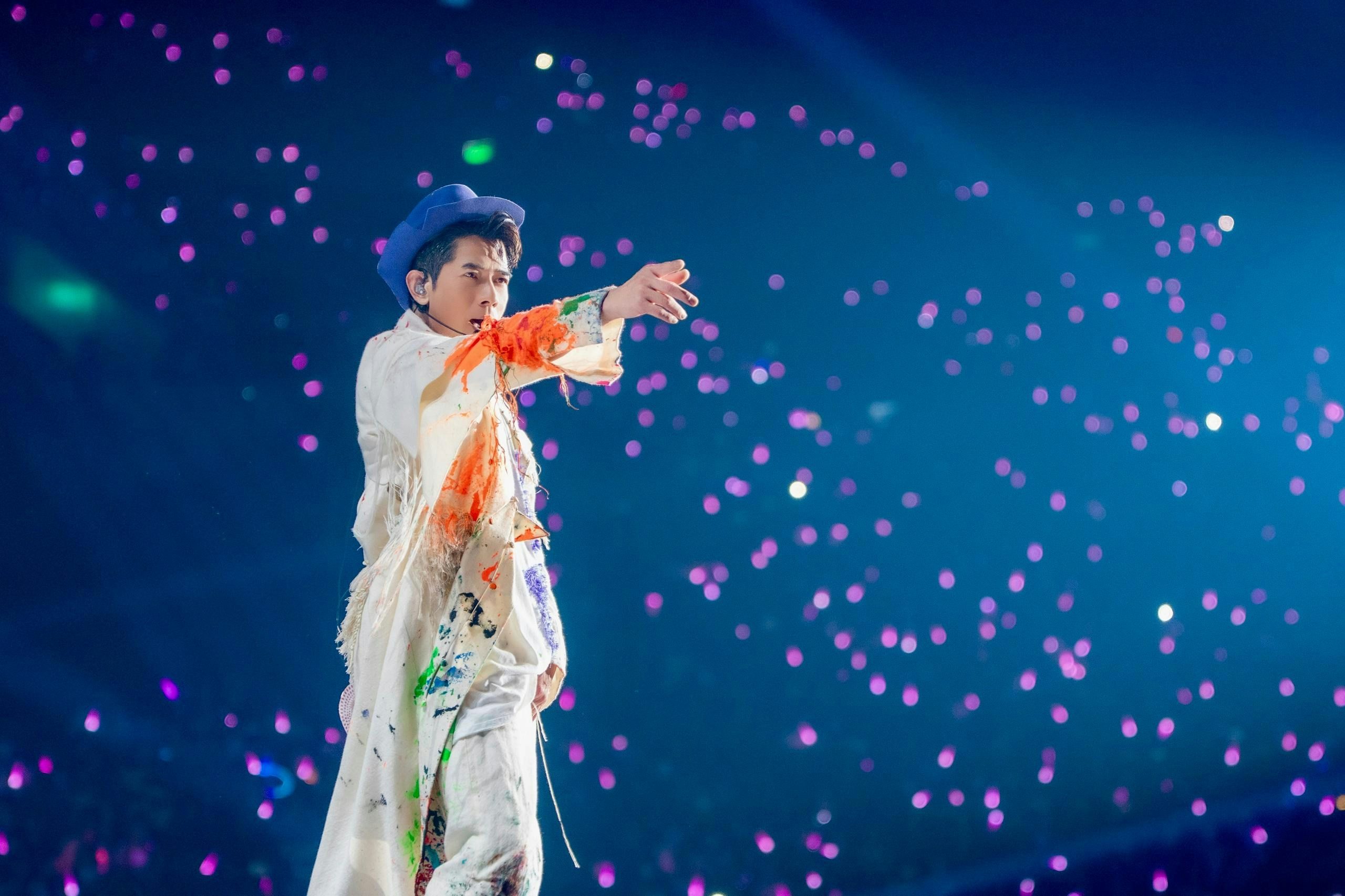 郭富城唱至中場又把觀眾帶進他的畫室,展示他的藝術天份,即場潑油彩作畫、邊唱《分享愛》,讓觀眾讃嘆不已。(官方圖片)