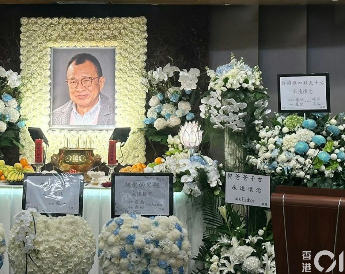 羅樂林和陳寶儀的花牌放在靈照左邊位置,上面寫著「許紹雄內姐夫千古」。(葉志明、陳順禎 攝)