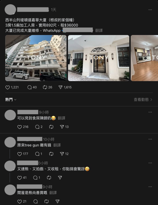 有經紀在threads分享隔籬大廈嘉華大廈的一個三房租盤,實用近892呎也叫價$36,000/月。(threads截圖)