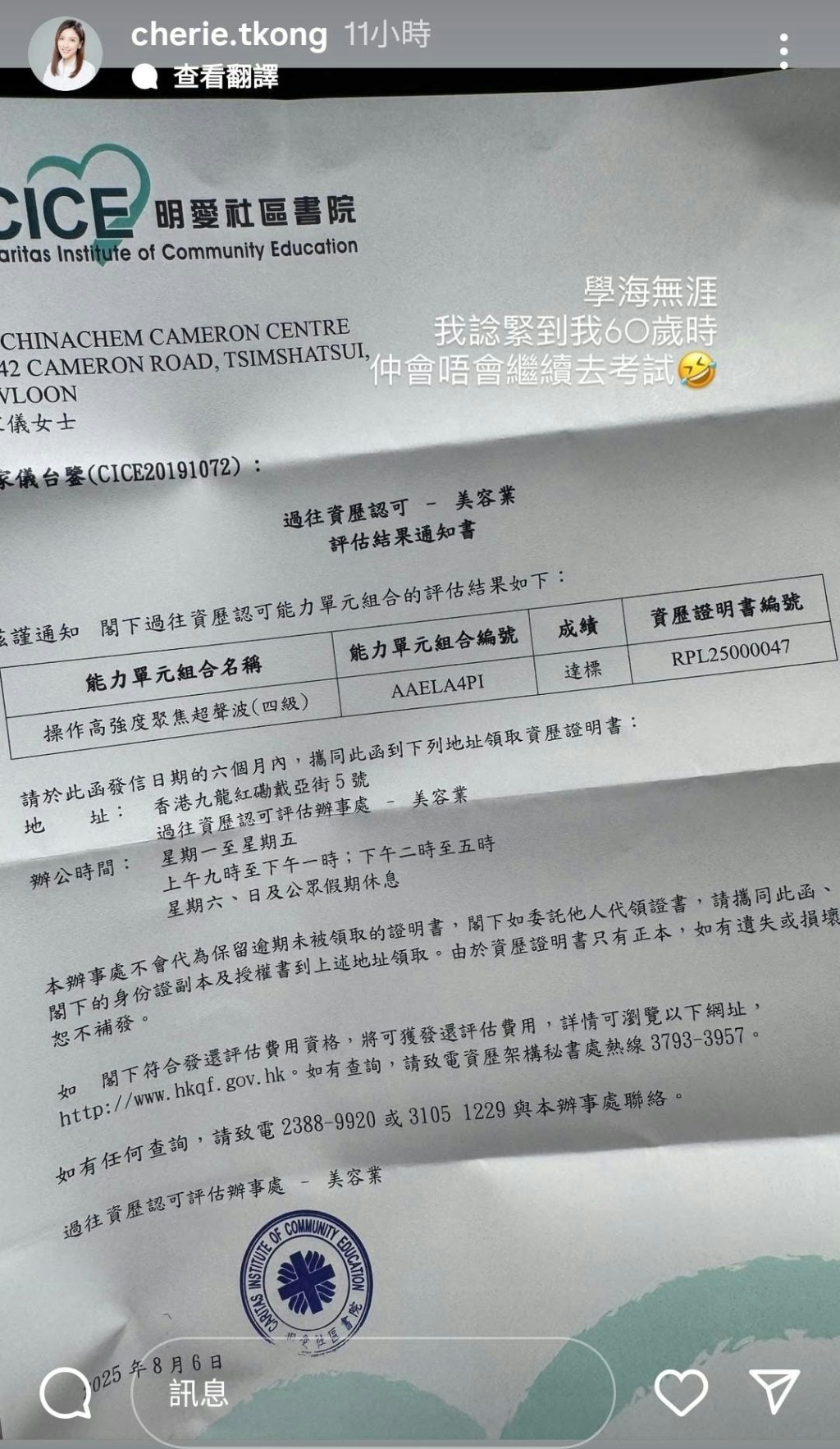 「操作高強度聚焦超聲波(四級)」證書。(IG截圖)