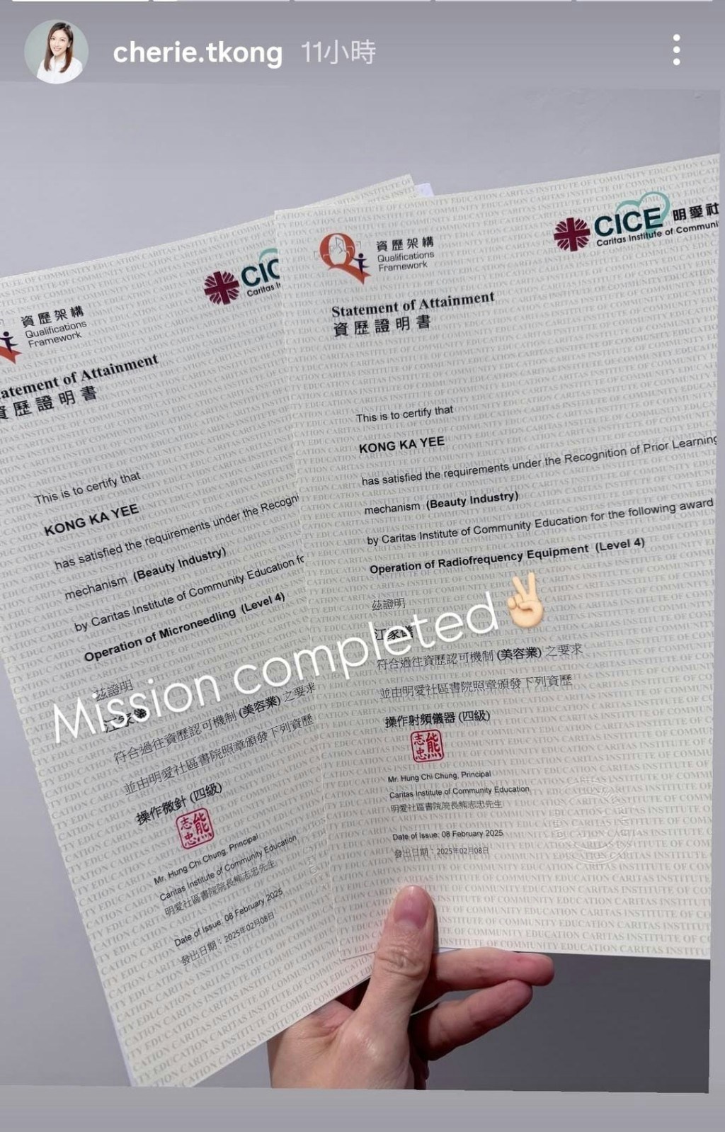 「操作微針(四級)」、「操作射頻儀器(四級)」證書。(IG截圖)