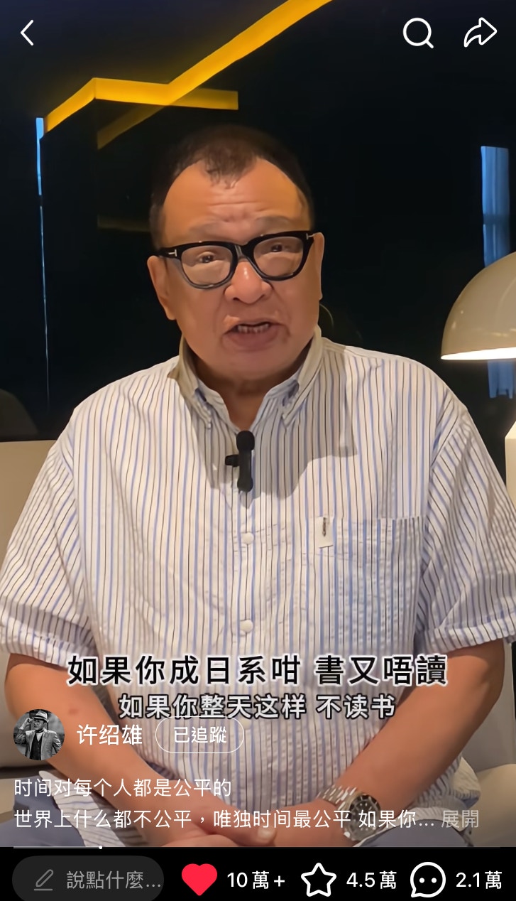 許紹雄留「遺言」勉勵網民  口吻如慈父:努力唔係為咗攞更多 #許紹雄