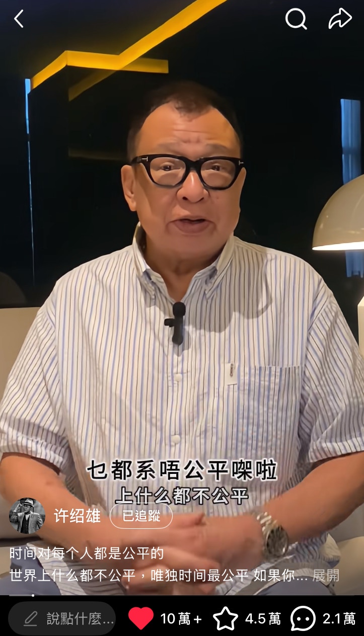許紹雄在小紅書發布的最後片段,當中他說道:「呢個世界,乜都係唔公平㗎啦,唯獨時間係最公平。如果你成日係咁,書又唔讀,運動又唔去做,使錢又唔節制,冇目標,冇愛好,冇期望,生活唔會自己變好。睇多啲書,賺多啲錢,少諗啲無謂嘢,努力唔係為咗攞更多,而係為咗有得揀。努力嘅意思,就係當好運嚟到嘅時候,你就覺得自己值得㗎啦。」