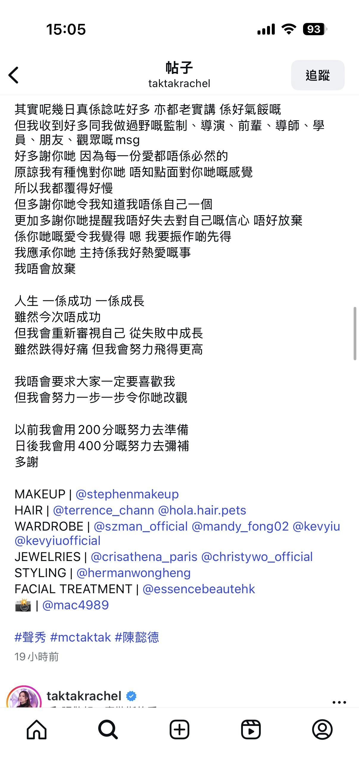 陳懿德在過去幾日並未有就有關事件和批評回應,潛水多日的她昨日終於在IG發長文認錯,寫道:「錯就要認,打就要企定,首先想講對唔住,容許我沉澱咗幾日,今次嘅表現的確唔好,所以到呢刻,我都無辦法放過自己。」