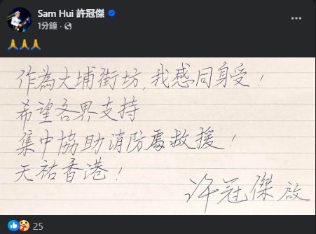 火警引起全民關注,連「歌神」許冠傑都在社交平台發聲,原來許冠傑都是大埔的街坊,他分享了自己的手寫信抒發了感受:「作為大埔街坊,我感同身受!希望各界支持,集中協助消防處救援!天佑香港!」