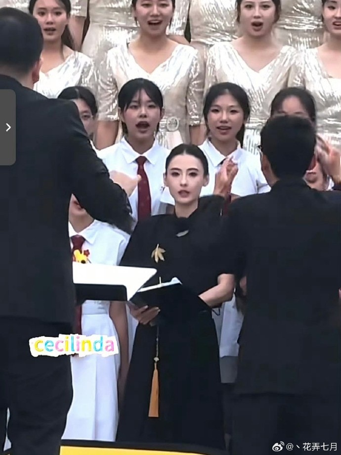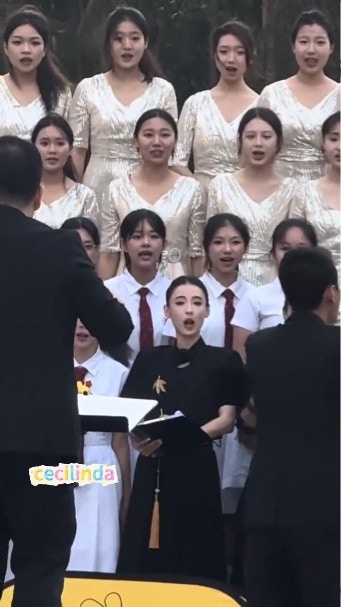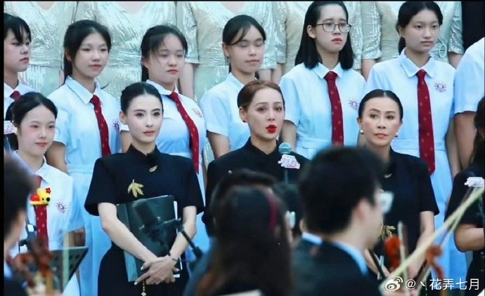 張栢芝與劉嘉玲及寧靜一起跟學生合唱。(微博圖片)