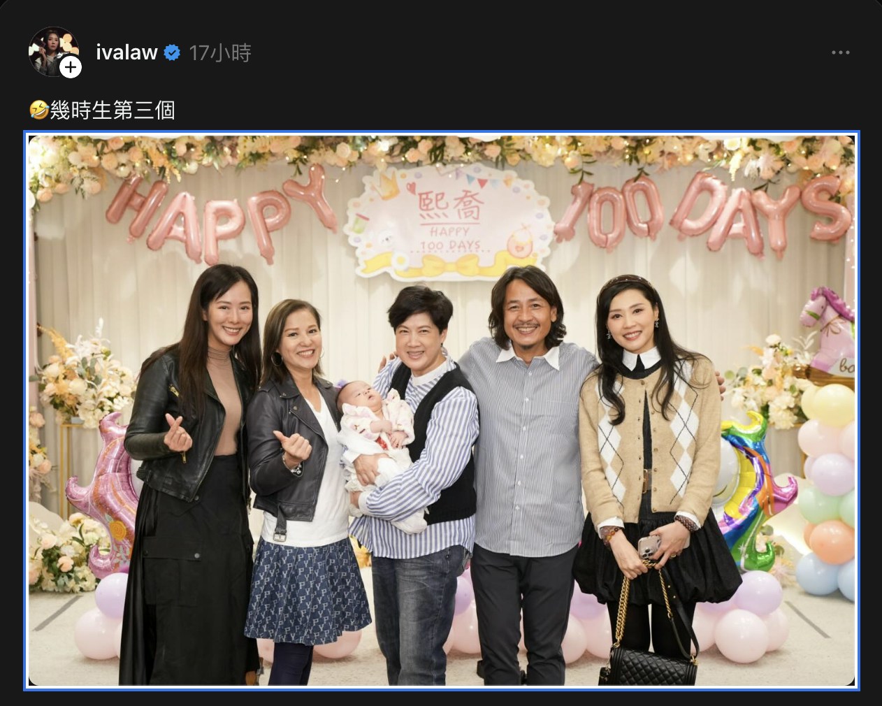 羅詠嫻昨晚亦是座上客,她在社交平台開心分享與黃澤鋒一家三口的合照,相中黃澤鋒抱著「小貴妃」,太太陳麗麗一臉幸福。然而,羅泳嫻在帖文中寫道:「幾時生第三個」,並附上一個大笑Emoji。