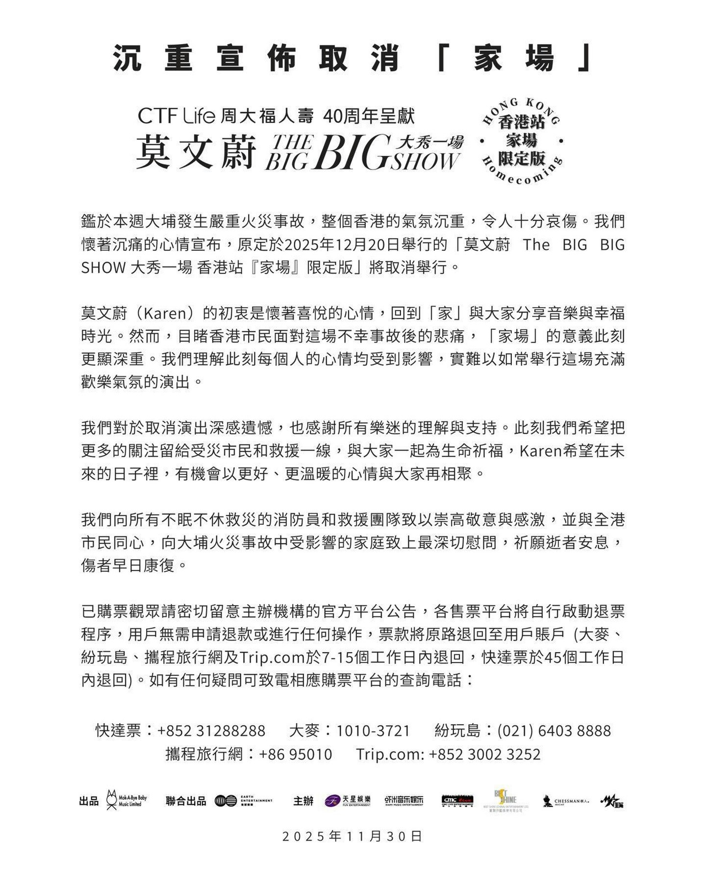 主辦方對於取消演出深感遺憾,也感謝所有樂迷的理解與支持。此刻他們希望把更多的關注留給受災市民和救援一線,與大家一起為生命祈福,Karen希望在未來的日子裡,有機會以更好、更溫暖的心情與大家再相聚。大會向所有不眠不休救災的消防員和救援團隊致以崇高敬意與感激,並與全港市民同心,向大埔火災事故中受影響的家庭致上最深切慰問,祈願逝者安息,傷者早日康復。