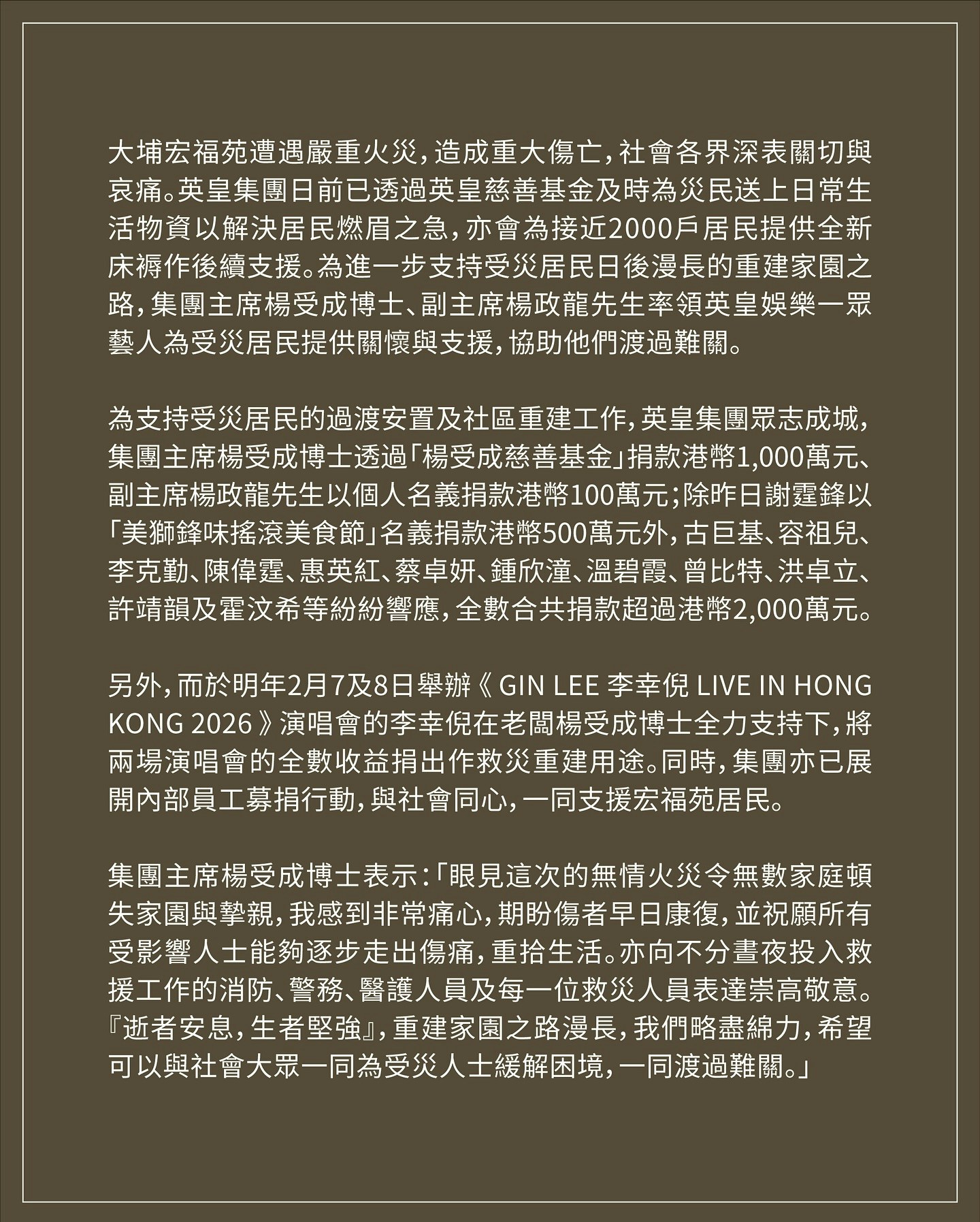 英皇集團今日(11月28日)發出新聞稿,集團主席楊受成博士透過「楊受成慈善基金」捐款港幣1,000萬元、副主席楊政龍先生以個人名義捐款港幣100萬元,謝霆鋒以「美獅鋒味搖滾美食節」名義捐款港幣500萬元外,古巨基、容祖兒、李克勤、陳偉霆、惠英紅、蔡卓妍、鍾欣潼、溫碧霞、曾比特、洪卓立、許靖韻及霍汶希等紛紛響應,全數合共捐款超過港幣2,000萬元。另,明年2月7及8日舉行的《GIN LEE 李幸倪LIVE IN HONG KONG 2026》演唱會的李幸倪在老闆楊受成博士全力支持下,將兩場演唱會的全數收益捐出作救災重建用途。