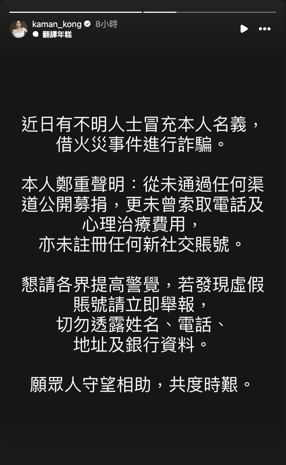 江嘉敏透過社交平台,以白底黑字就「近日有不明人士冒充本人名義,借火災事件進行詐騙」發出嚴正聲明,以正視聽:「本人鄭重聲明:從未通過任何渠道公開募捐,更未曾索取電話及心理治療費用,亦未註冊任何新社交賬號。懇請各界提高警覺,若發現虛假賬號請立即舉報。」江嘉敏提醒大家保護好個人私隱,「切勿透露姓名、電話、地址及銀行資料。願眾人守望相助,共度時艱。」