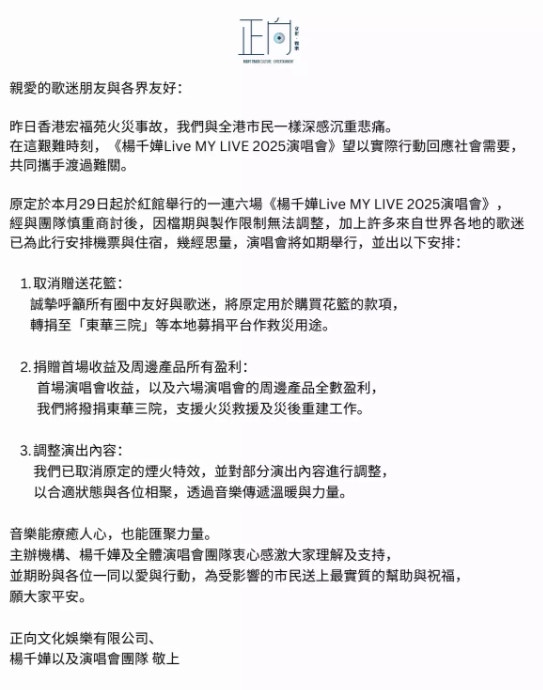 另外,楊千嬅在紅館舉行的《楊千嬅Live MY LIVE 2025演唱會》今晚將如期舉行,昨晚千嬅綵排時以一身黑衣以表哀悼,有網民拍得她向等候的Fans揮手。早前主辦方宣布落實三項安排:取消贈送花籃、捐贈首場收益及周邊產品全數盈利至東華三院,並調整演出內容,包括取消煙火特效,以更合適狀態與觀眾共渡難關。