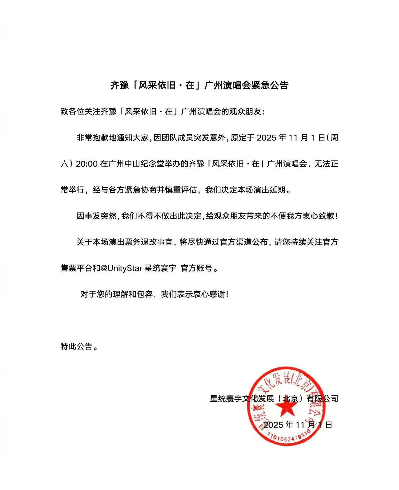 屠穎原定今晚要出席齊豫在廣州舉行的演唱會,但主辦單位突然發布公告指「因團隊成員突發意外,演唱會無法正常舉行」。(微博圖片)
