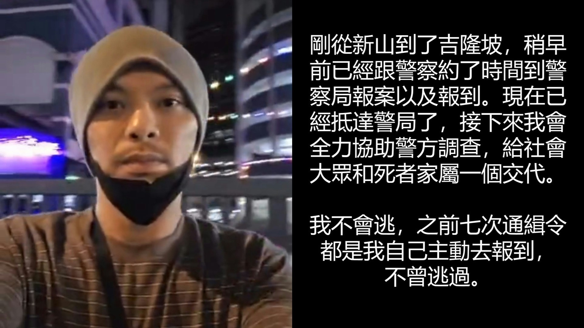 馬來西亞歌手黃明志因涉台灣31歲網紅「護理系女神」謝侑芯酒店猝逝案,而引起全網關注。據馬媒指,吉隆坡警方於昨日(4日)改以謀殺方向調查,通緝黃明志逾6小時都找不到他,指其已經潛逃,並把黃明志列入通緝名單,對其展開追捕。網紅「護理系女神」謝侑芯酒店猝逝。(YouTube@戲引子) 黃明志今日(5日)凌晨黃明志於社交平台發文表示自己不會潛逃:「剛從馬來西亞新山到了吉隆坡,稍早前已經跟警察約了時間到警察局報案及報到。現在已經抵達警局了,接下來會全力協助警方調查,給社會大眾和死者家屬個交代。」他強調「之前7次通緝令都是我自己主動去報到,不曾逃過」,所以今次他亦不會逃,除了發文強調不會潛逃外,他還上載了自己在路邊的自拍影片。 黃明志上載了自己在街上的片段。(ig@namewee) 黃明志發文表示自己不會潛逃。(ig@namewee)
