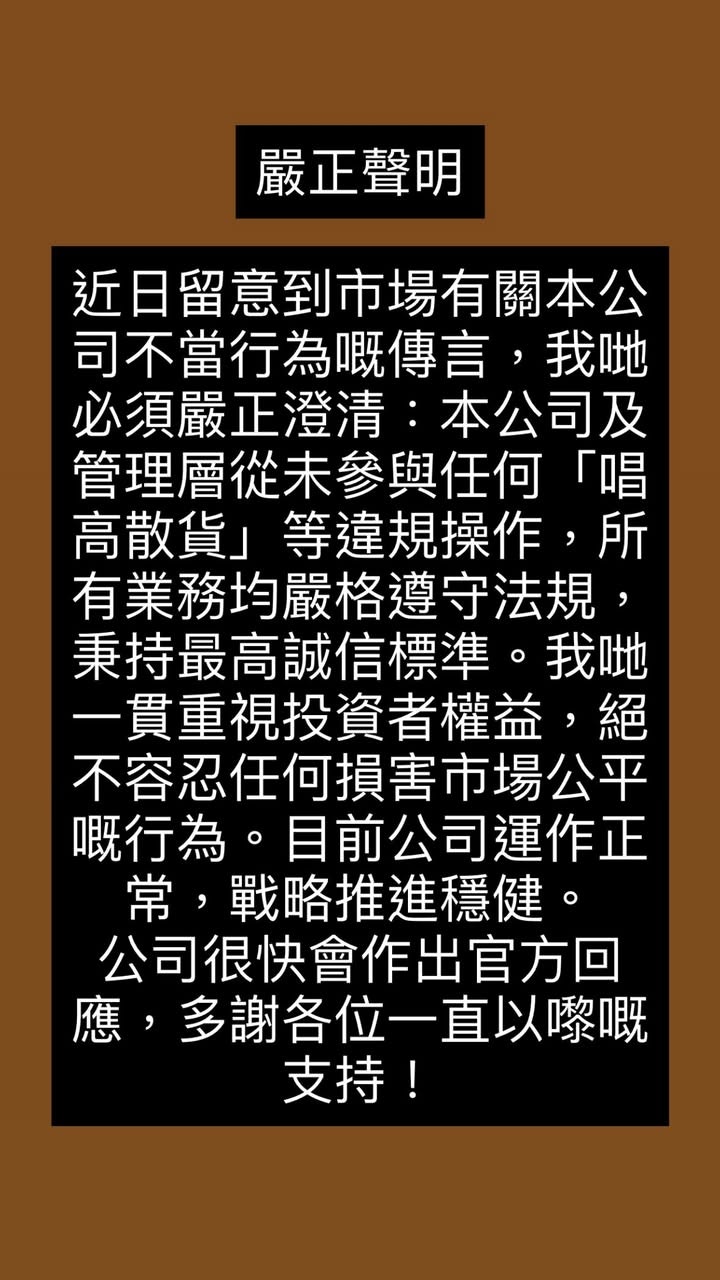 其後黃梓漫再出「嚴正聲明」:「近日留意到市場有關本公司不當行為嘅傳言,我哋必須嚴正澄清:本公司及管理層從未參與任何『唱高散貨』等違規操作,所有業務均嚴格遵守法規,秉持最高誠信標準。我哋一貫重視投資者權益,絕不容忍任何損害市場公平嘅行為。目前公司運作正常,戰略推進穩健。公司很快會作出官方回應,多謝各位一直以嚟嘅支持!」