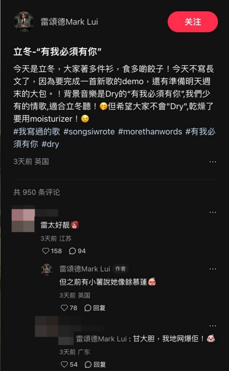 雷頌德雖然已移民英國,但對傳統節日依然非常重視,日前立冬,他在社交平台分享與太太撐台腳的照片,並以「立冬-“有我必須有你”」寫道:「今天是立冬,大家著多件衫,食多啲餃子!今天不寫長文了,因為要完成一首新歌的demo,還有準備明天週末的大包。背景音樂是Dry的“有我必須有你”,我們少有的情歌,適合立冬聽!但希望大家不會"Dry",乾燥了要用moisturizer!」透露正完成一首新歌之餘,又可向太太示愛,可謂一箭雙鵰。