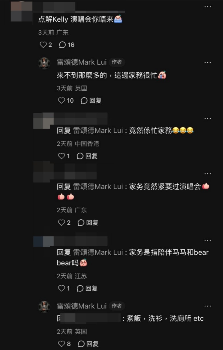 相中,雷頌德和太太身穿同色系服飾,襯到絕。可能趕做新歌的緣故,雷頌德略顯倦容;相反太太則精神飽滿,輕輕搭著老公膊頭,頭貼頭合照。網民大讚雷太皮膚還是那麼緊緻,又大讚「雷太好靚」,但對於網民的讚美,他竟這樣回覆對方:「但之前有小薯說她像余慕蓮」,引來網民爆笑,並紛紛為雷太抱不平,「咁大膽,我地網爆佢」。也有內地網民問:「點解Kelly(內地)演唱會你唔來?」雷頌德笑言:「來不到那麼多的,這邊家務很忙」,還舉例家務包括:煮飯、洗衫及洗廁所等,盡現其幽默一面。