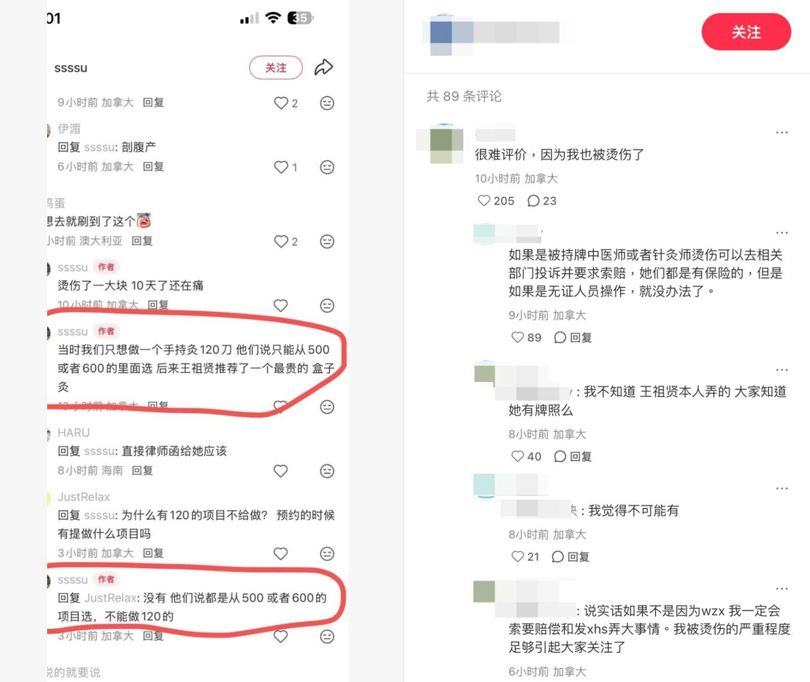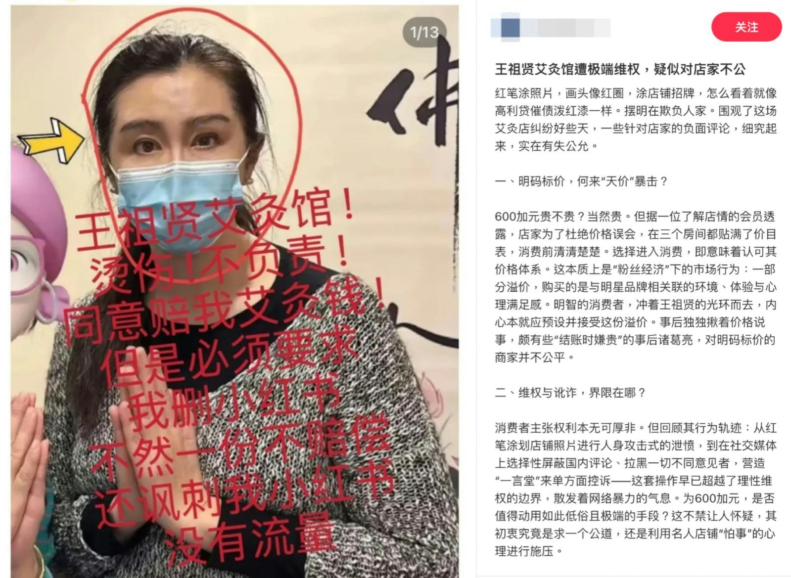爆料中還提到員工提出加薪要求時,王祖賢先是裝作聽不懂,隨後以「店裡顧客多,你愛做就做,隨便你」來回應。網民更指王祖賢在人前就禮貌周周,但背後卻恃住店裡客多自己名氣又大,不怕請不到人,故此就壓榨員工,並慨歎王祖賢的行為讓她心中「女神的形象徹底坍塌了」。另外,更有其他網民留言,聲稱花600加元做艾灸,結果卻被燙傷,引發大批網民熱議。王祖賢暫時未就事件作出任何回應,事件孰真孰假有待釐清。