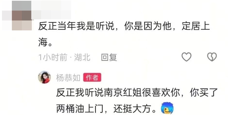 另外,有網民甚至重提她曾介入富商婚姻的舊事,留言表示:「反正當年我是聽說,你是因為他,定居上海。」而楊恭如隨後就回覆表示:「反正我聽說南京紅姐很喜歡你,你買了兩桶油上門,還挺大方。」而她此回答被網民指很緊貼時事。