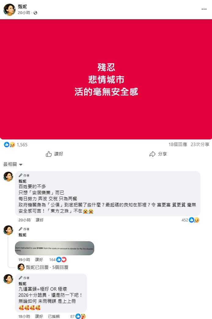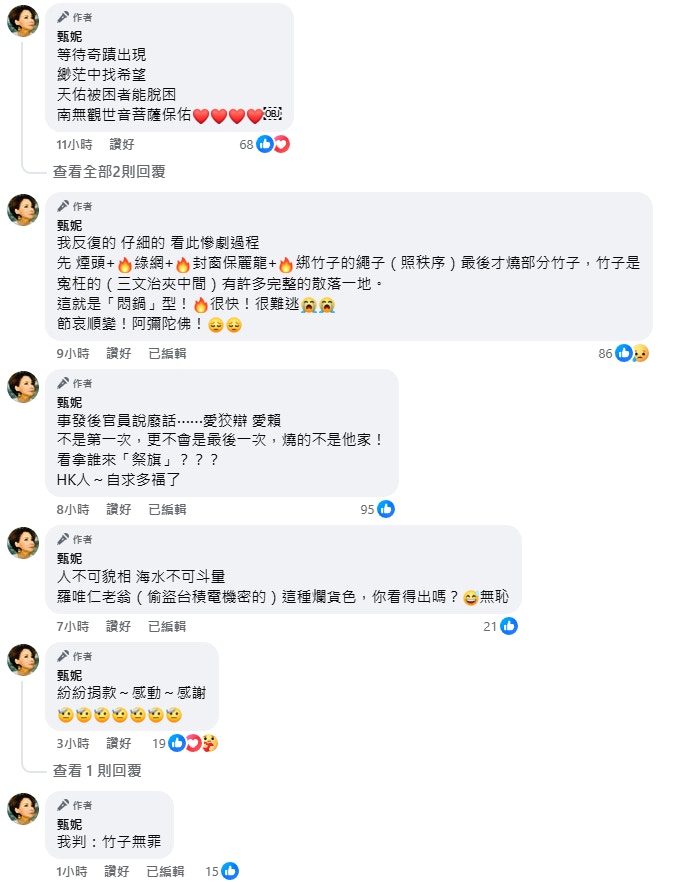 政務司司長陳國基昨日(27日)就災情接受傳媒訪問時表示發展局正與業界會面,商討以更具耐燃性的金屬棚架全面取代傳統的竹棚,但不少市民就認為今次大火起火的原因並不是竹棚,而是涉及不少人為原因,尤其是未有使用阻燃網致使火災極速蔓延至相鄰座數,但政府卻把起火原因歸咎於竹棚物料,而甄妮就認為:「我反復的仔細的看此慘劇過程,先煙頭+🔥綠網+🔥封窗保麗龍+🔥綁竹子的繩子(照秩序)最後才燒部分竹子,竹子是寃枉的(三文治夾中間)有許多完整的散落一地。這就是『悶鍋』型!🔥很快!很難逃😭😭節哀順變!阿彌陀佛!😔😔」此外,甄妮亦分享了捐款10萬元的截圖,有歌迷留言感謝她的慷慨,甄妮就回覆:「綿薄之力!拋磚引玉!我永遠愛HK」。