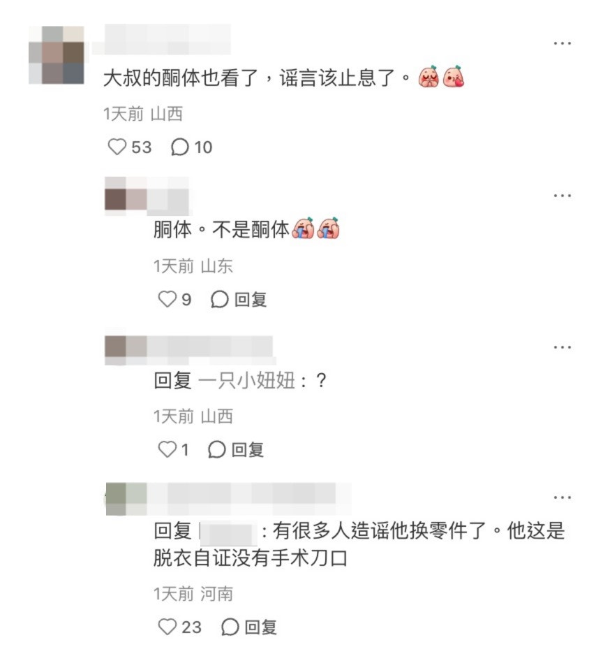 有大批網民看到李連杰的最新片段後,都留言表示:「謠言止於智者」、「杰哥這個年紀這個身材可以」、「給人逼沒招了,直接脫光了」、「居然因為辟謠終於又看到了杰哥的肉體」、「這身材,那確實應該是很久沒運動了」、「給杰哥逼成啥樣了,只能通過坦誠相待來辟謠了」、「謠言該停止了吧」、「有很多人造謠他換零件了。他這是脫衣自證沒有手術刀口」。