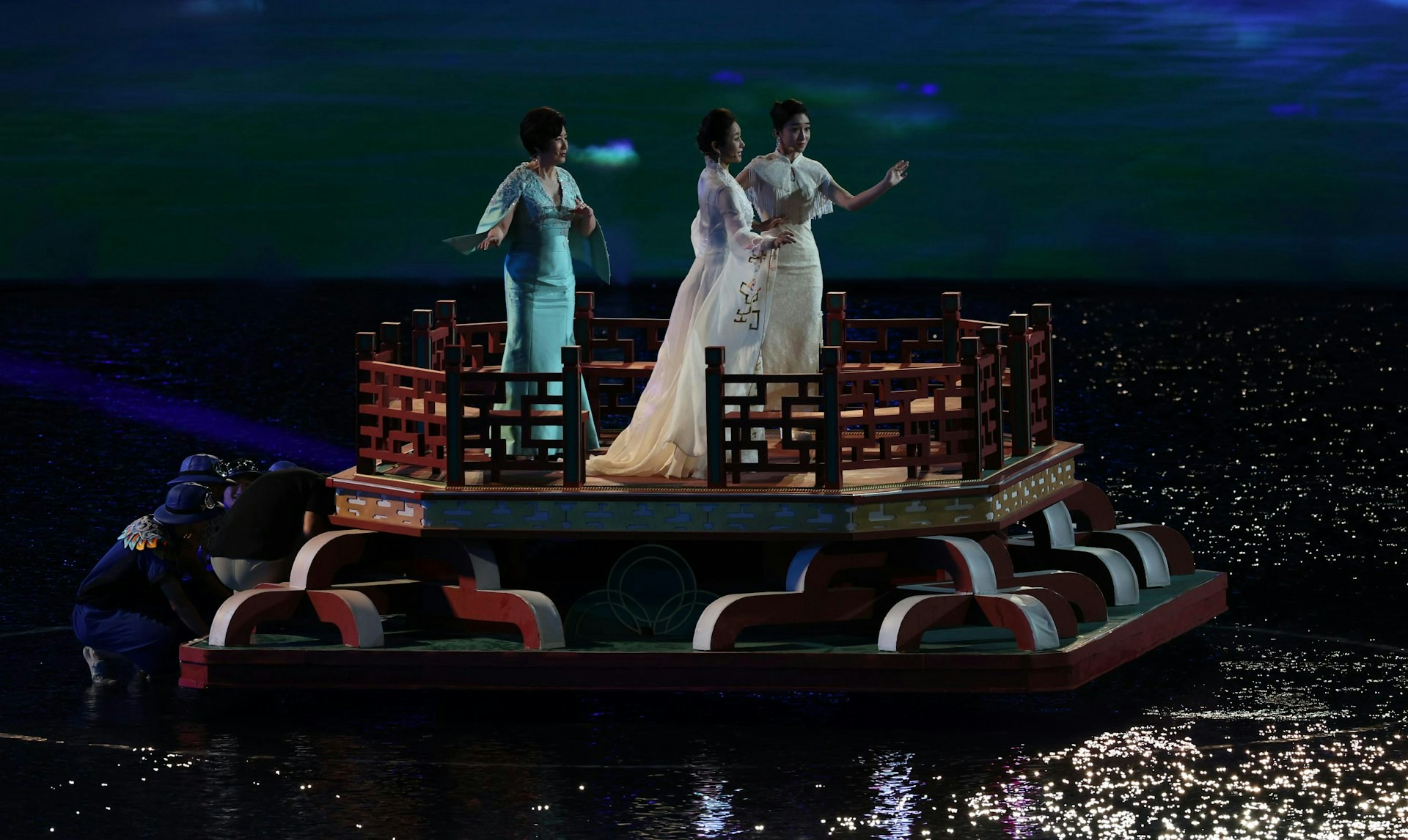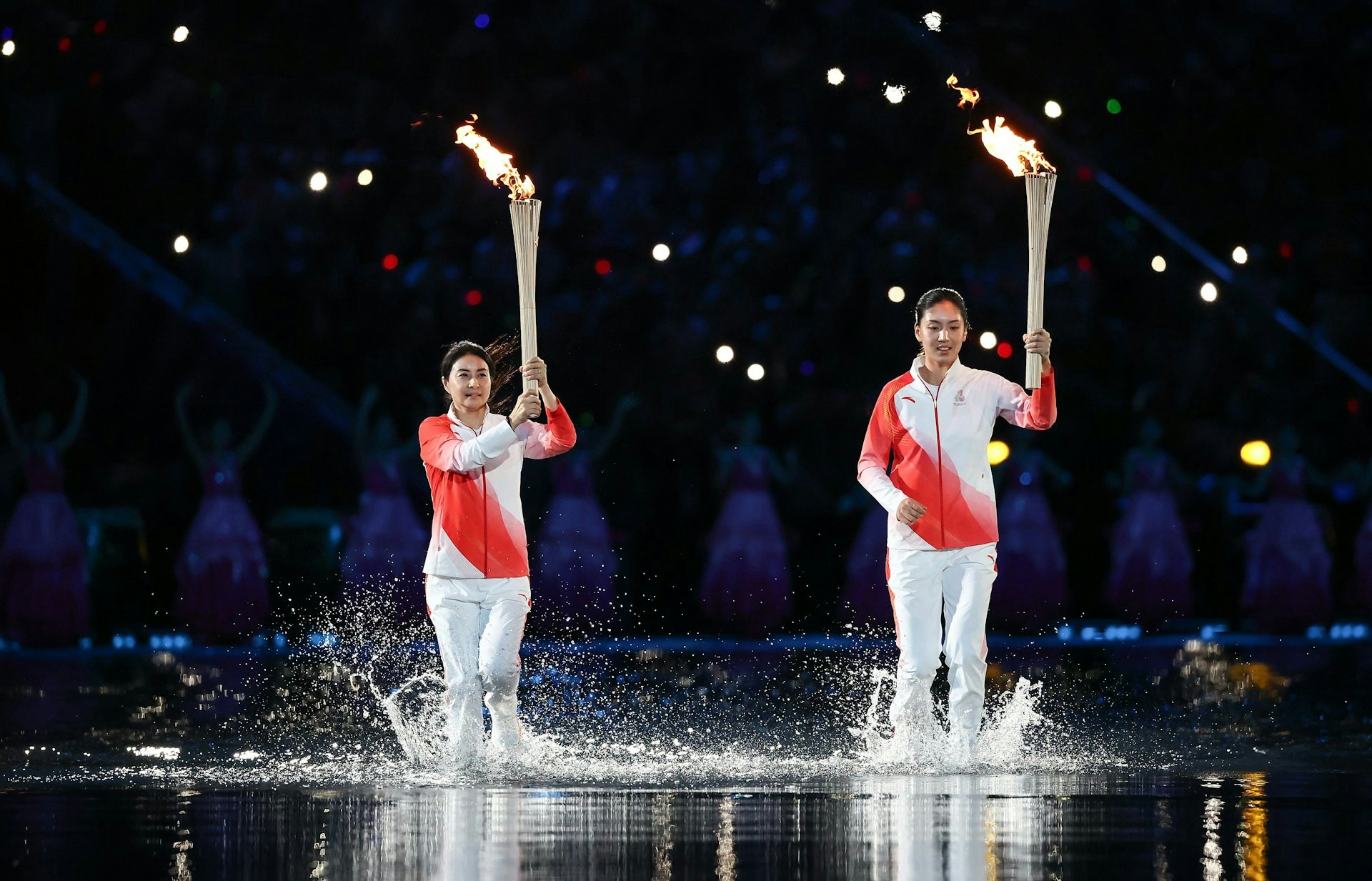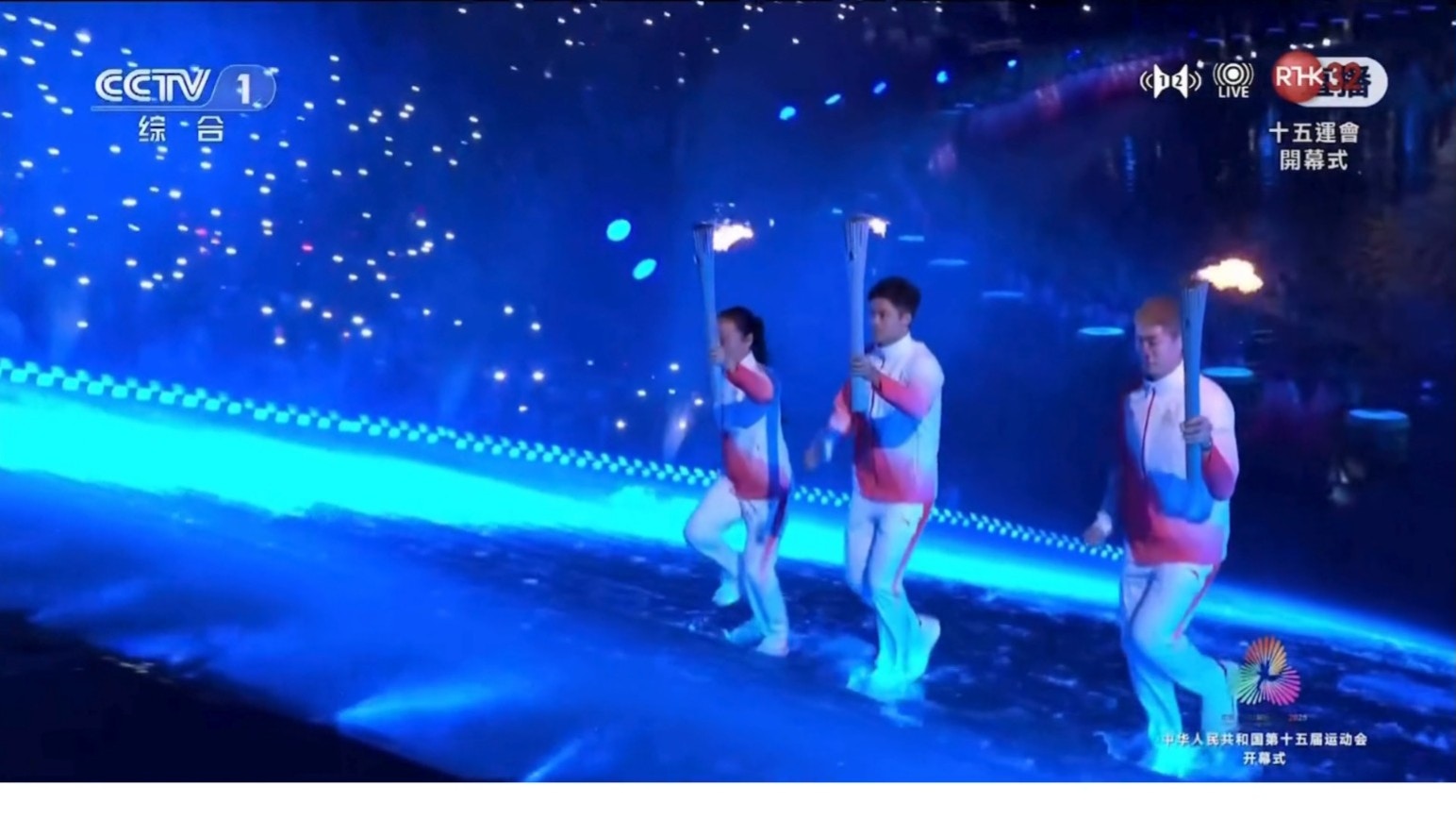 開幕禮表演時便用上水做主題,甚至傳送火炬時也要選手在水中踏浪而來,圖左為前國家跳水運動員郭晶晶。(全運會)