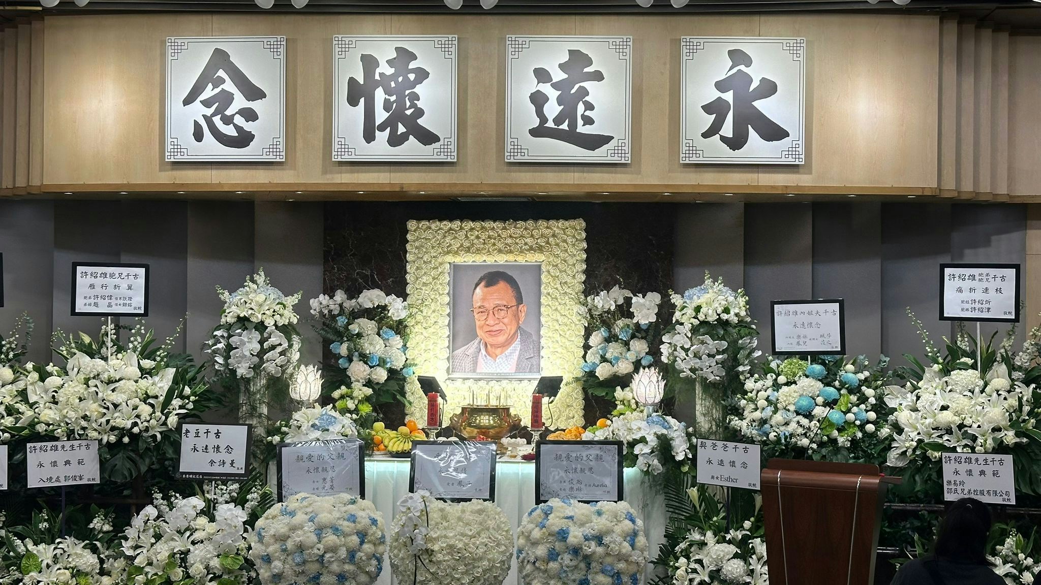 許紹雄生前人緣甚佳,靈堂內外佈滿了各界親友致送的悼念花牌,足見其地位。家屬在靈堂入口處亦悉心擺放了三張照片,中央為遺照;左側是Benz雄身穿白色西裝、面露慈祥笑容的生活照;右側則是他的「歡喜哥」經典劇照,許紹雄曾憑《使徒行者》覃歡喜一角於《萬千星輝頒獎典禮2014》獲頒「最受歡迎電視男角色」,角色早已深入民心。同時相信,許紹雄的歡笑聲,將永遠留在觀眾心中,長流不息。
