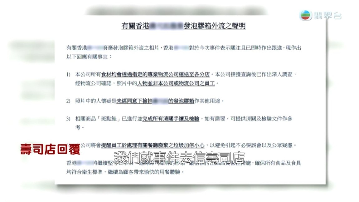 由於節目拍到裝運食品的發泡箱,寫上「斑點鮭」(三文魚)字樣的紙條,並有連鎖壽司店地址,但打了格仔,節目沒有公開壽司店的名稱,引起網民議論紛紛。壽司郎的母公司Food & Life昨晚發聲明,斥《東張》報道內容不盡不實,將訴諸法律行動,「僅憑單方面資訊,在沒有事實根據作出猜測性報導,並影射及 #間接誹謗 本公司使用走私食材,直接誤導公眾及嚴重影響本公司聲譽,更引起廣大市民不必要的疑慮,香港壽司郎對有關媒體的虛假報導表示強烈抗議並將採取法律行動。」壽司郎重申所有食品均符合衛生標準,對有關廢棄發泡膠箱遭非法使用之相片極度關注,並強調已於早前向 TVB《東張西望》澄清有關事宜。
