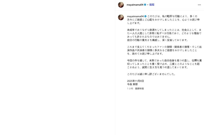 今森茉耶為「未滿20歲飲酒」發文道歉。(Instagram@mayaimama04)