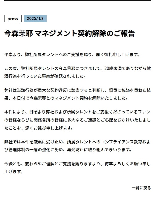 經紀公司同日透過官方聲明指出:「確認今森茉耶有未成年飲酒事實,屬重大違約行為。經審慎協議後,決定自今日起解除合約。」(seju)
